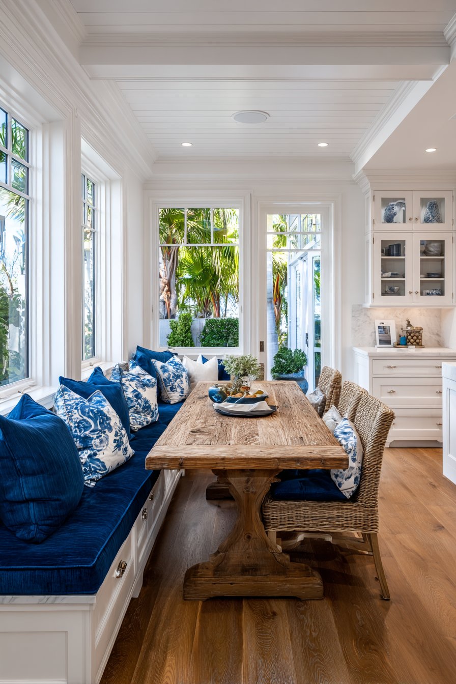 1. Cozy Navy Blue and White Oak Breakfast Nook