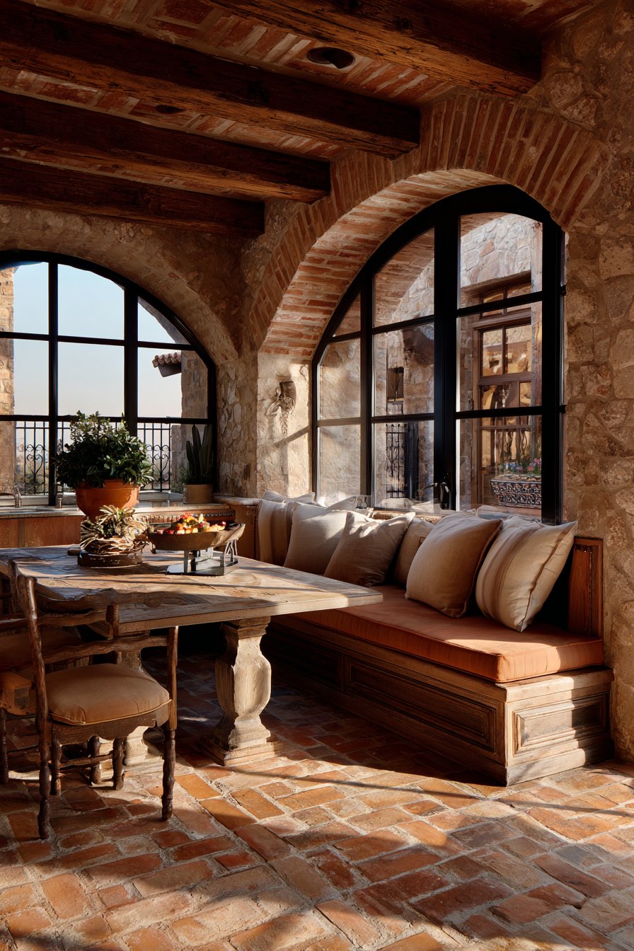 The rustic wooden table with distressed finish anchors the dining nook while reinforcing the authentic Mediterranean aesthetic through its weathered appearance and substantial construction. Hand-painted tile accents add artisanal character that speaks to the craftsmanship traditions of Mediterranean cultures while wrought iron details provide structural interest and authentic material references.