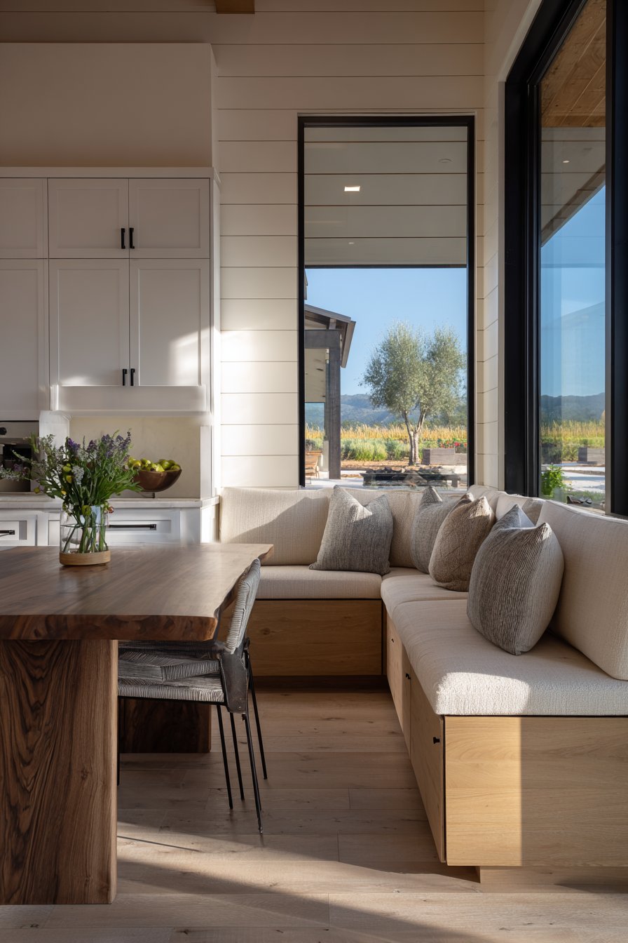 Positioned strategically beneath a large picture window, this banquette seating maximizes the connection between indoor and outdoor spaces, creating a dining area that feels open and airy throughout the day. The natural light filtering through the window highlights the subtle texture variations in the linen upholstery, revealing the fabric’s inherent beauty and creating visual depth that changes with the shifting daylight. Hidden storage compartments underneath the seating provide practical solutions for maintaining the clean aesthetic while storing dining essentials.