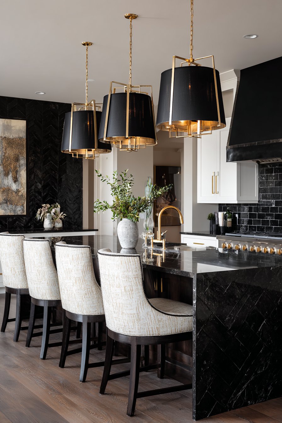 Recognizing that lighting makes or breaks kitchen functionality and ambiance, this design showcases a thoughtfully layered lighting scheme that serves multiple purposes. Multiple gold pendant lights featuring black fabric shades hang above a black marble island, creating strong vertical elements that define the island’s footprint while providing focused task lighting for food preparation and casual dining. The black shades prevent glare while directing light downward where it’s needed most, and their opaque quality creates dramatic contrast against the gold frames that catch and reflect light from other sources throughout the room.