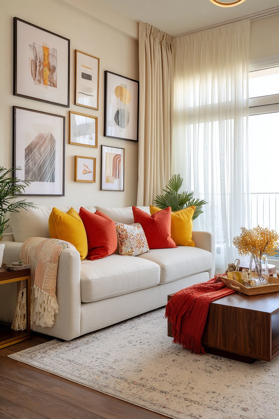 - Layer colorful textiles like throw pillows and blankets for easy updates