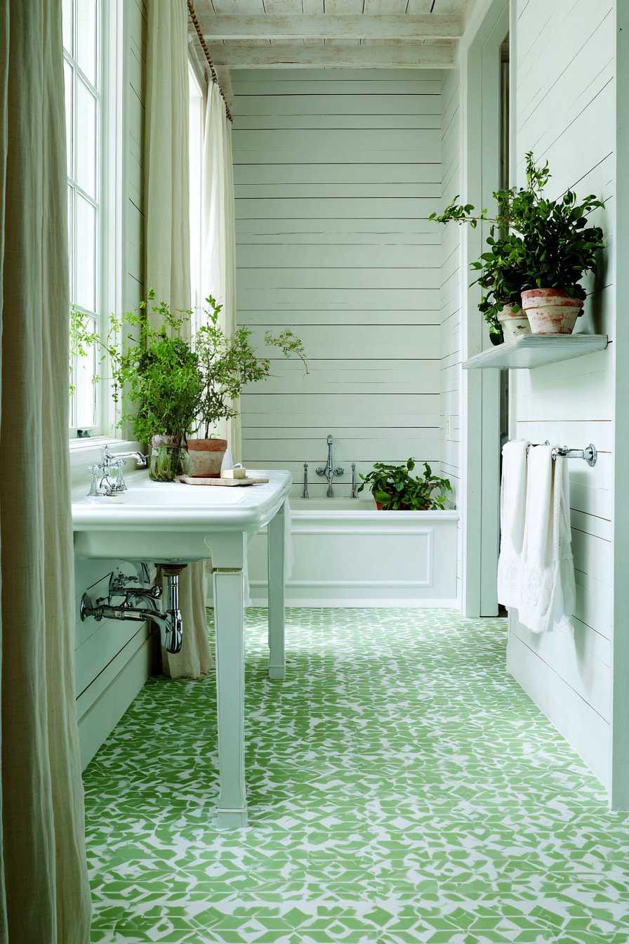 Mint green hexagonal floor tiles establish this bathroom’s cheerful, coastal-inspired personality from the ground up. The geometric pattern adds playful visual interest while the soft color keeps the look fresh rather than overwhelming. White shiplap walls provide classic coastal texture, their horizontal lines creating a sense of expanded width. This combination evokes seaside cottages and beach house charm without relying on obvious nautical clichés.