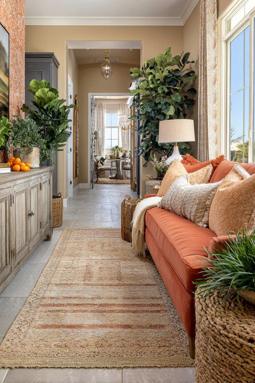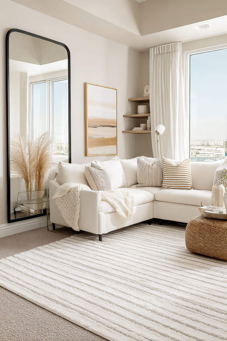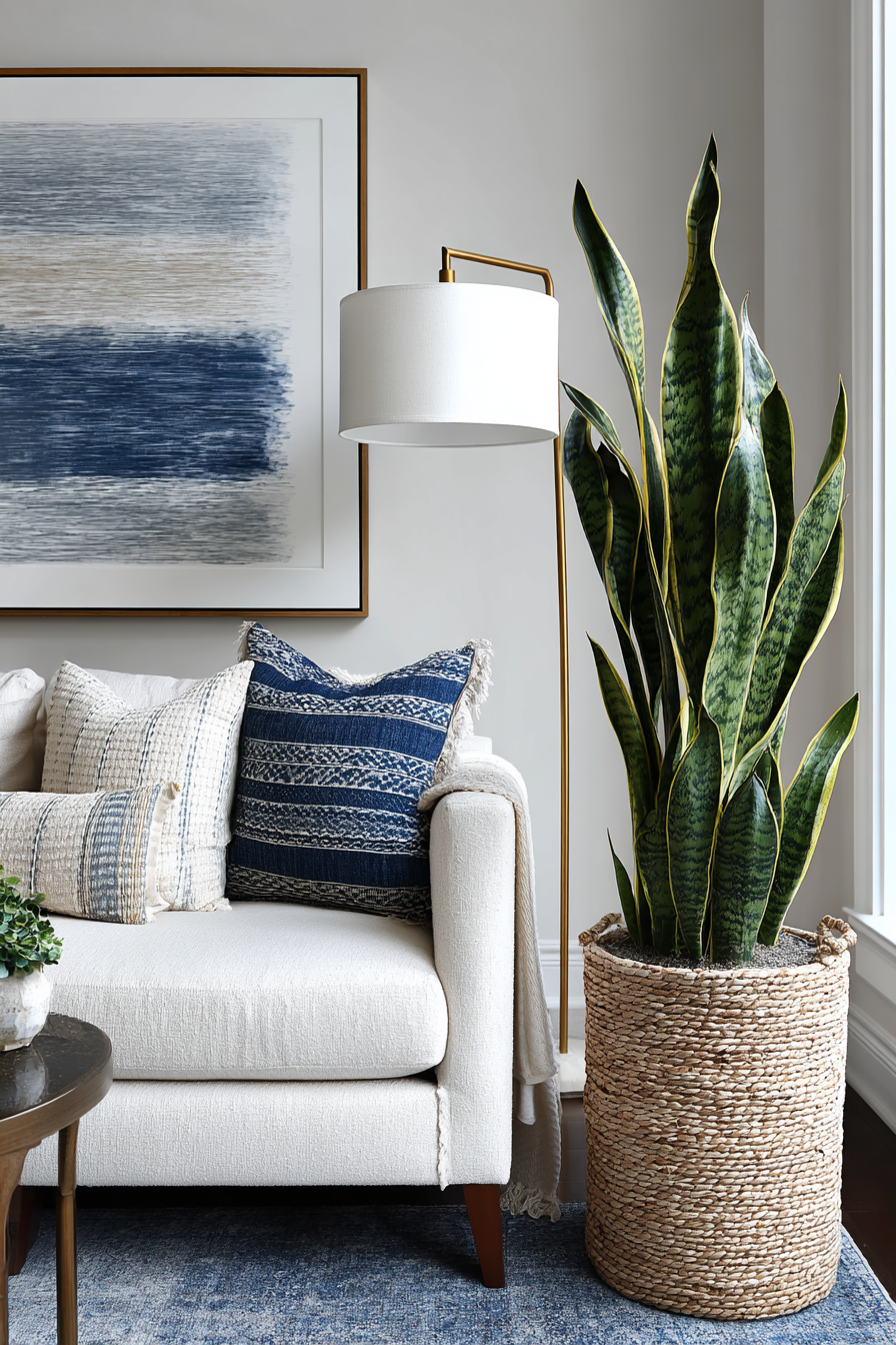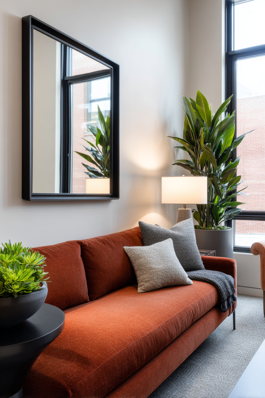 Incorporate vertical elements in your decor. Tall plants, floor lamps with slender profiles, or vertical artwork draws the eye upward and creates balance against the room’s horizontal emphasis. A fiddle-leaf fig or snake plant in a corner adds life and height without consuming much floor space.