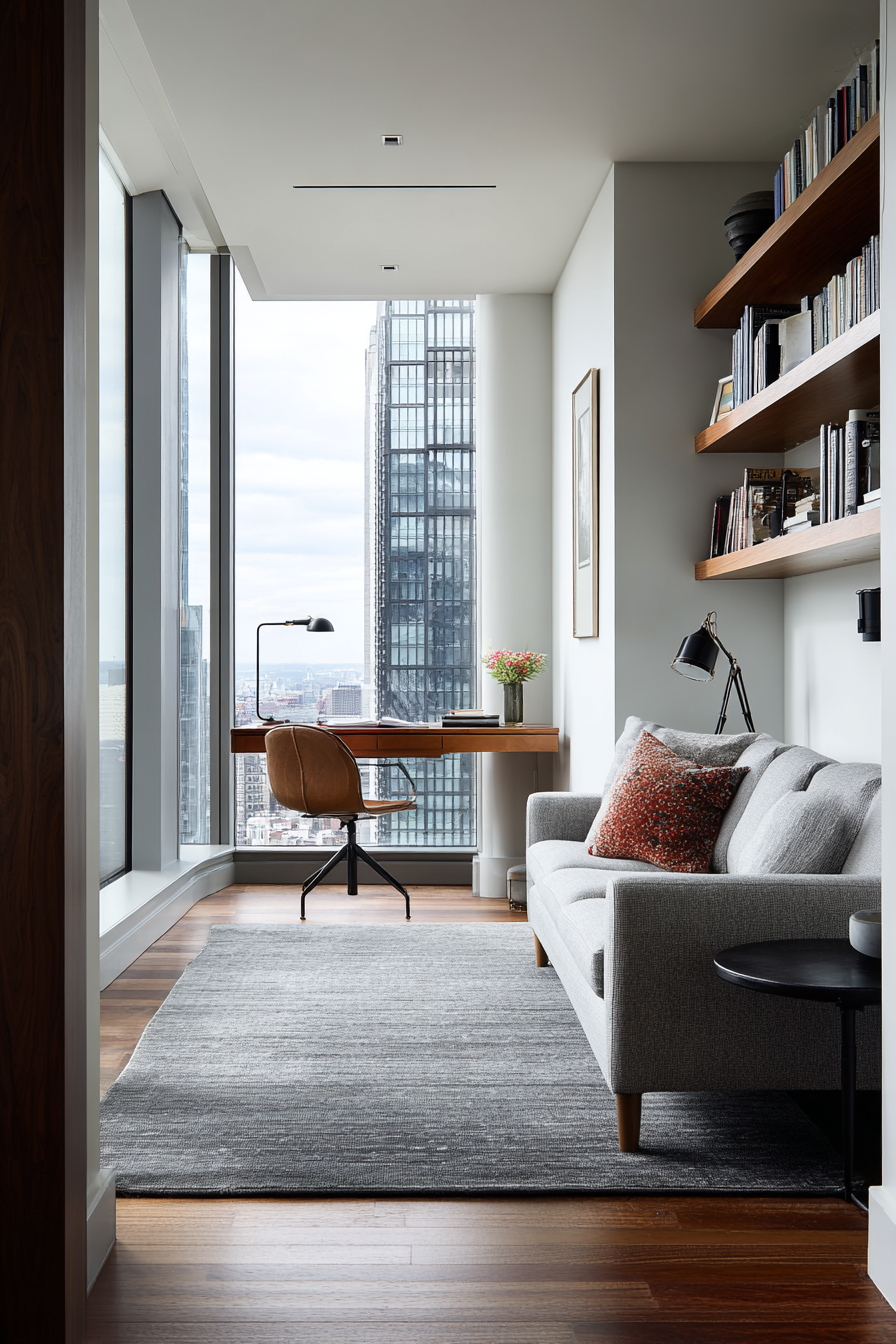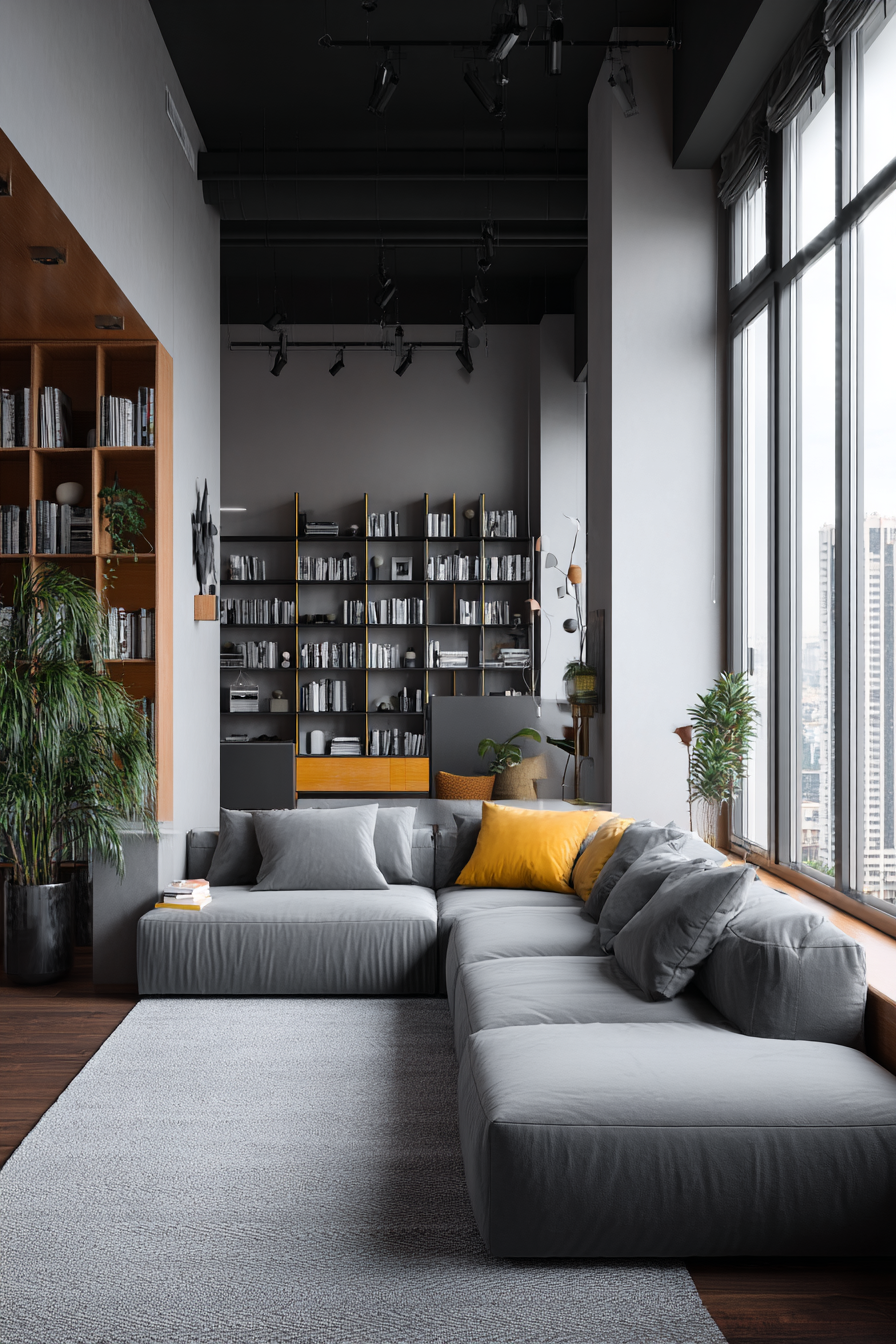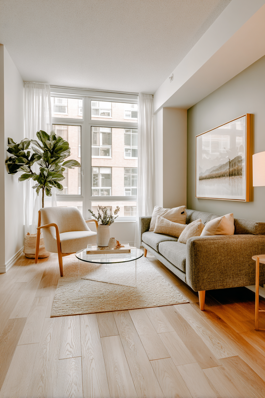 Incorporate vertical elements in your decor. Tall plants, floor lamps with slender profiles, or vertical artwork draws the eye upward and creates balance against the room’s horizontal emphasis. A fiddle-leaf fig or snake plant in a corner adds life and height without consuming much floor space.
