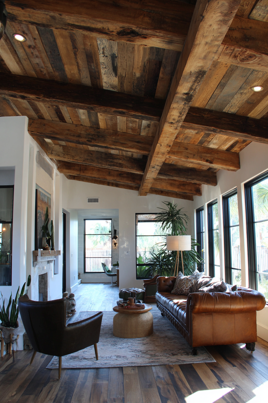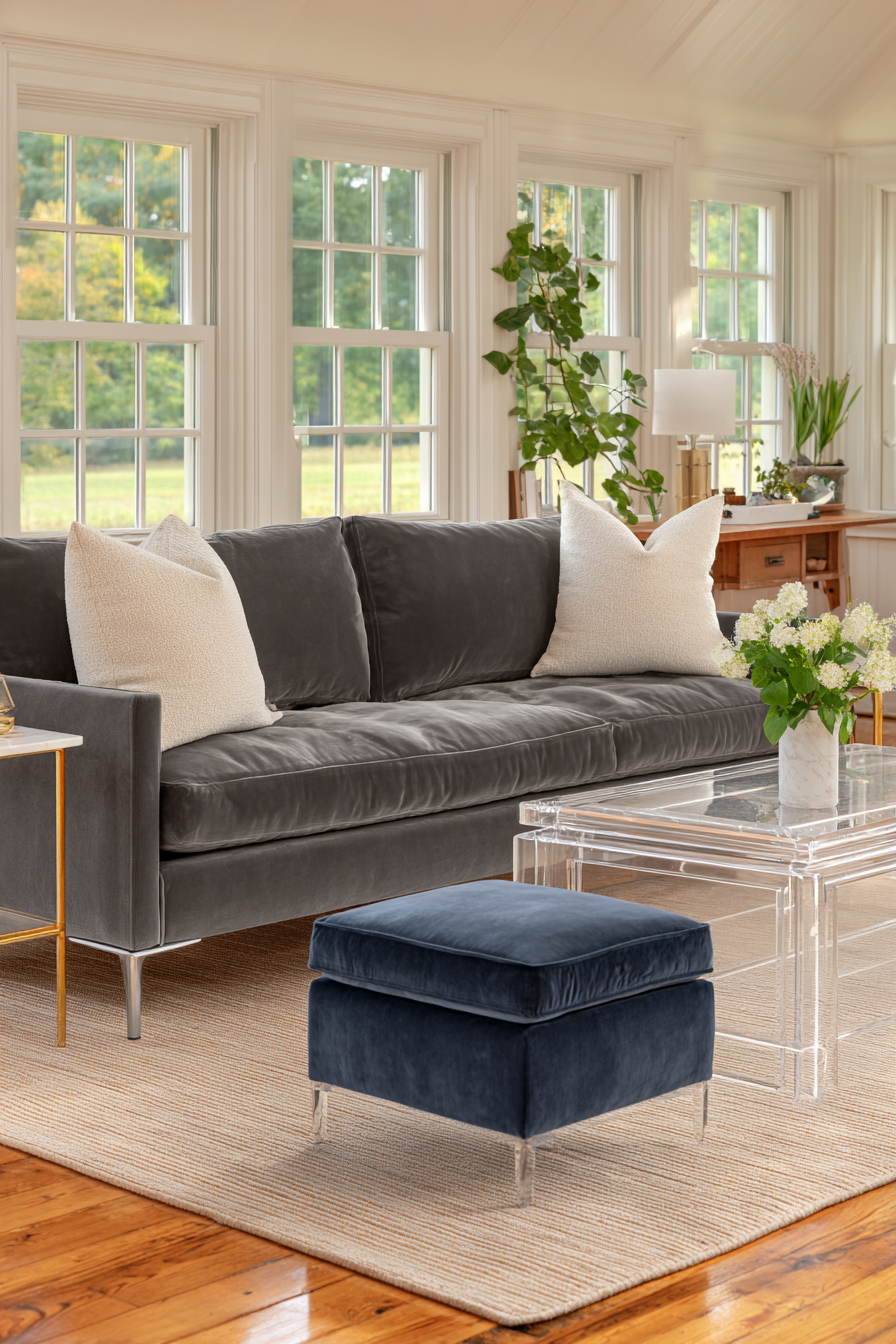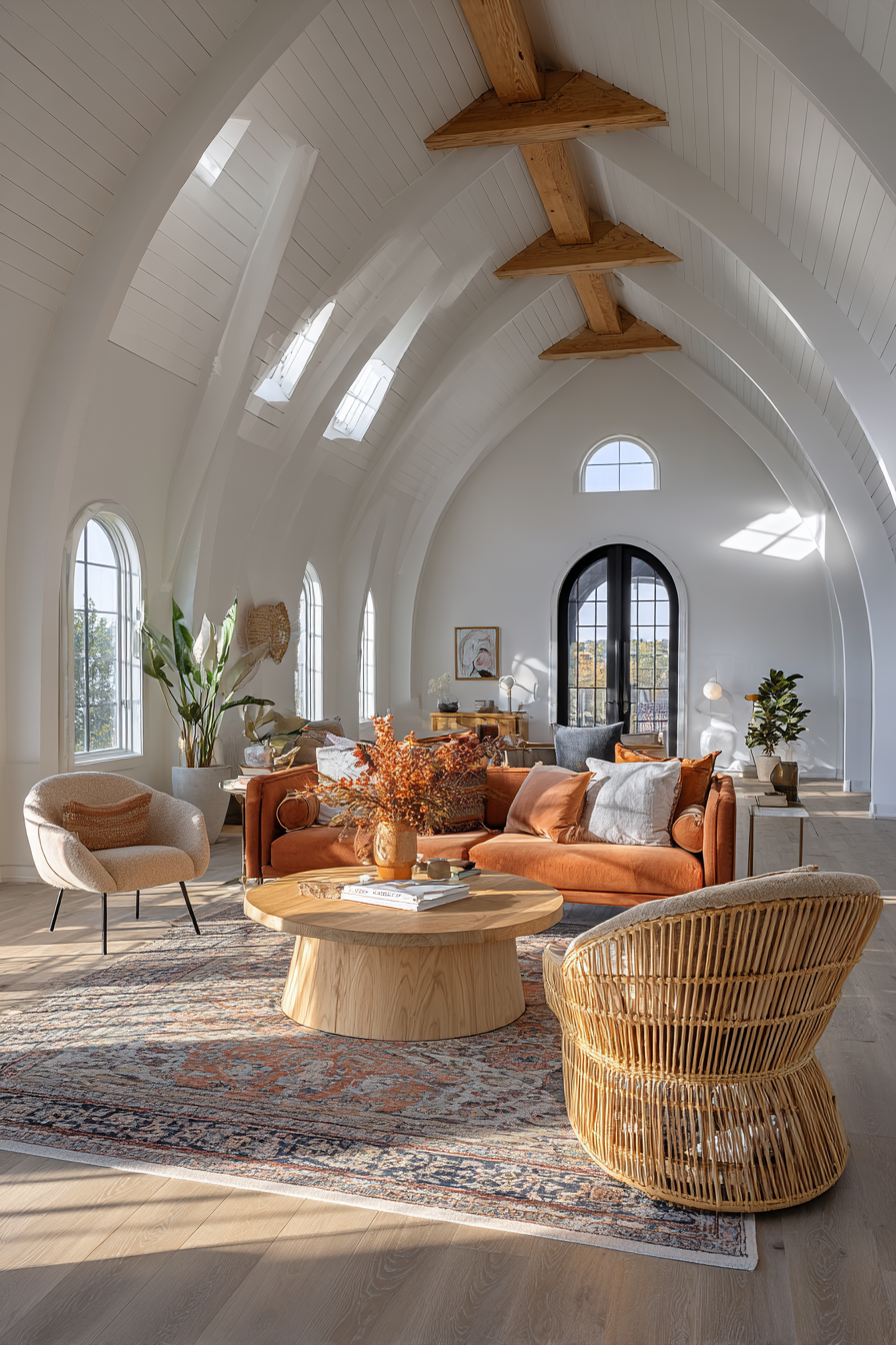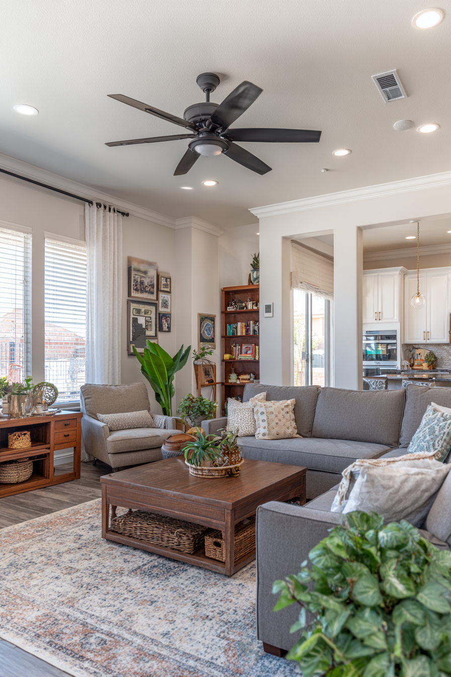 Incorporate vertical elements in your decor. Tall plants, floor lamps with slender profiles, or vertical artwork draws the eye upward and creates balance against the room’s horizontal emphasis. A fiddle-leaf fig or snake plant in a corner adds life and height without consuming much floor space.