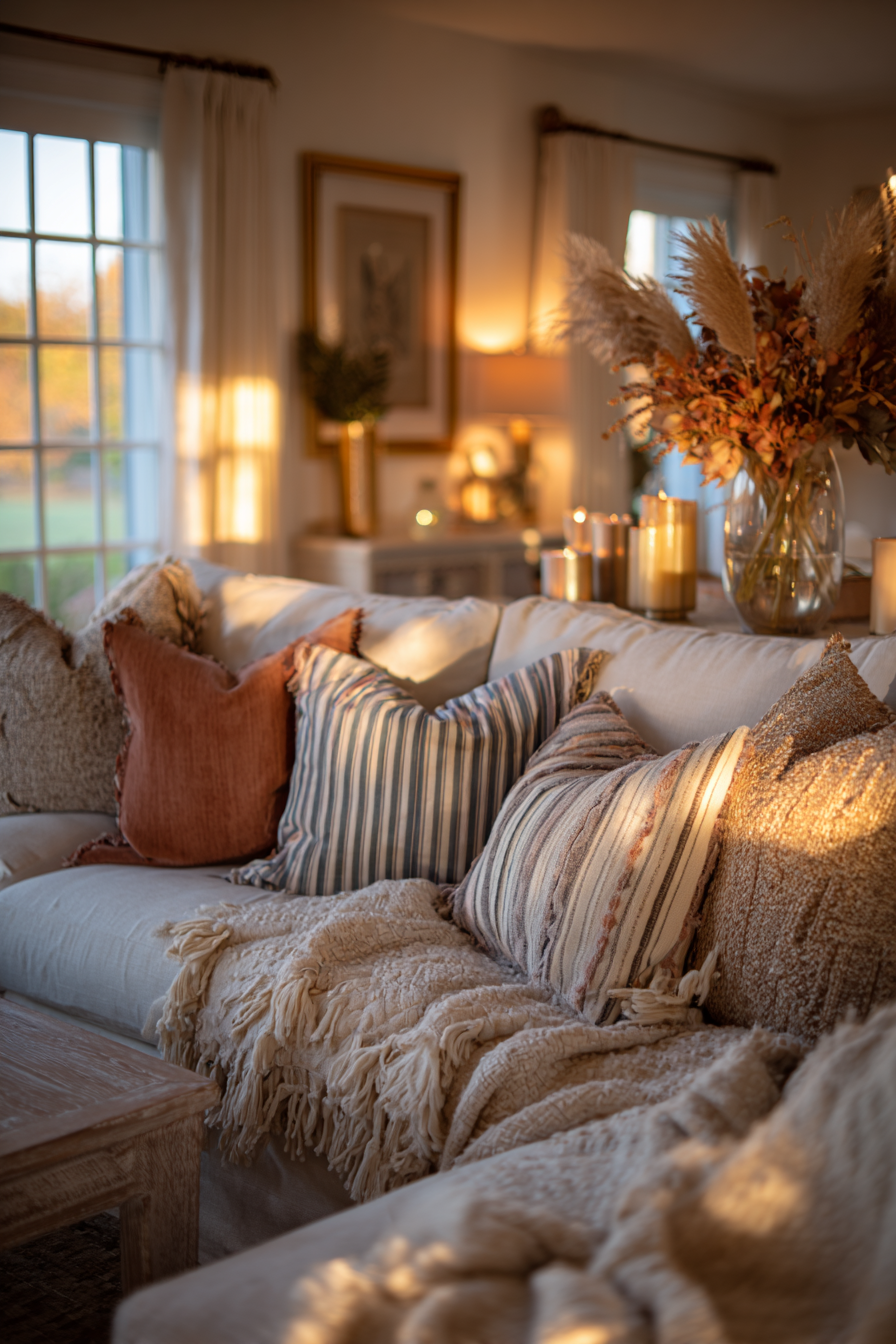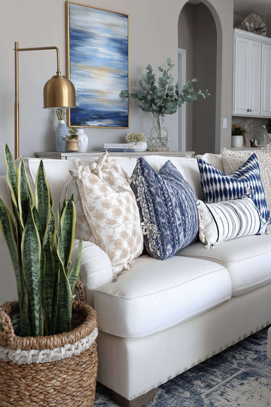 Keep accessories proportional to your space and furniture. Oversized throw pillows might look luxurious in magazine spreads, but in a narrow room, they can overwhelm a sofa and make it appear even bulkier. Choose medium-sized pillows in coordinating colors and patterns for visual interest without bulk.