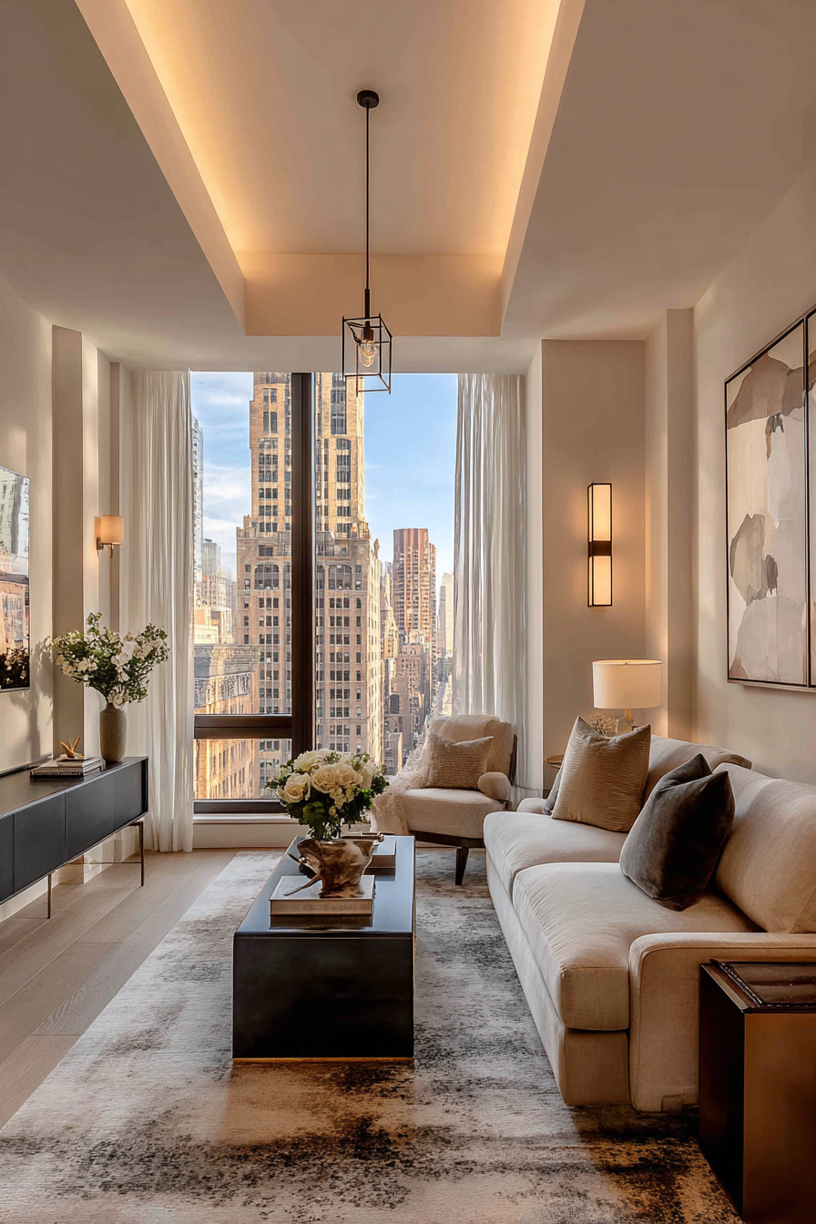 Wall-mounted sconces save precious surface area on side tables while providing beautiful ambient light. Install them at eye level on the long walls to guide the eye horizontally across the space. Pendant lights or a linear chandelier can also work well if your ceiling height allows, especially when hung over a coffee table or seating area.