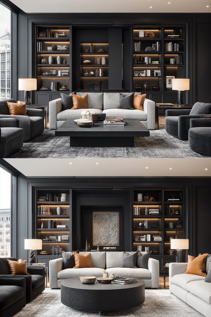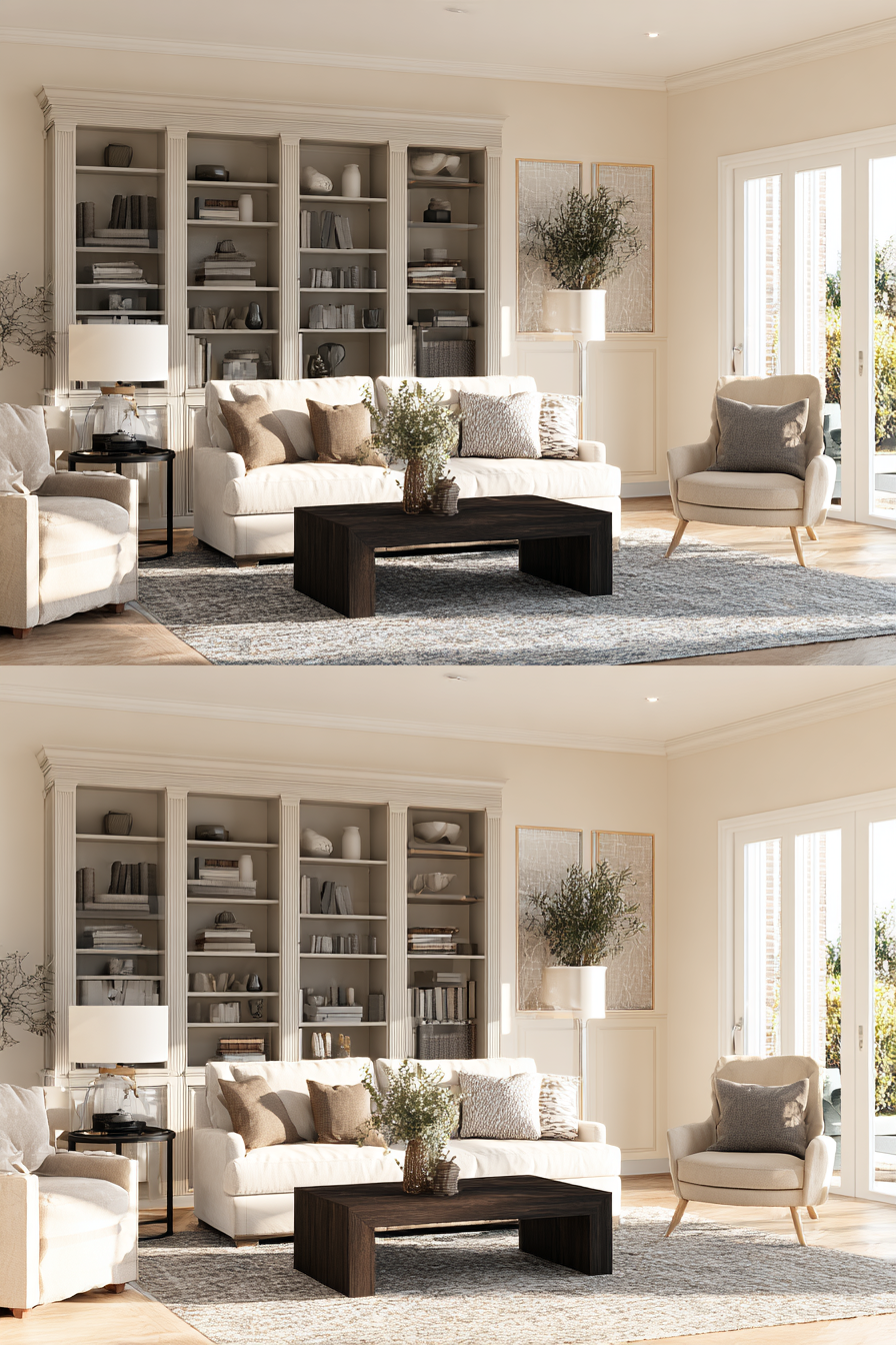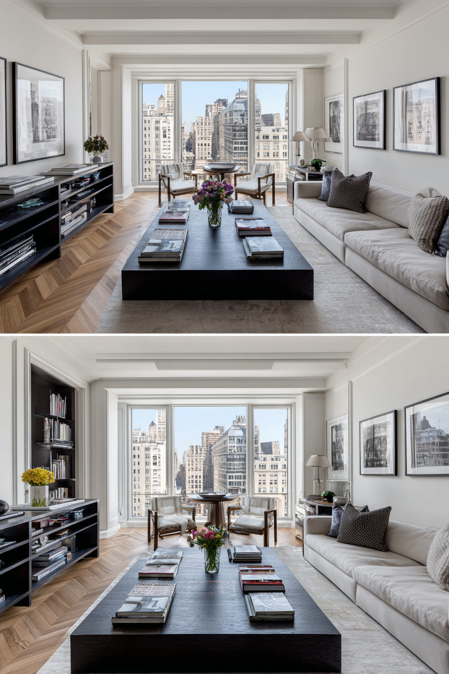 Don’t choose a coffee table that’s too long or runs parallel to the room’s length. An oversized rectangular table extending most of the sofa’s length reinforces the narrow proportions. Opt for a round, oval, or square table that provides functionality without elongating the space visually.