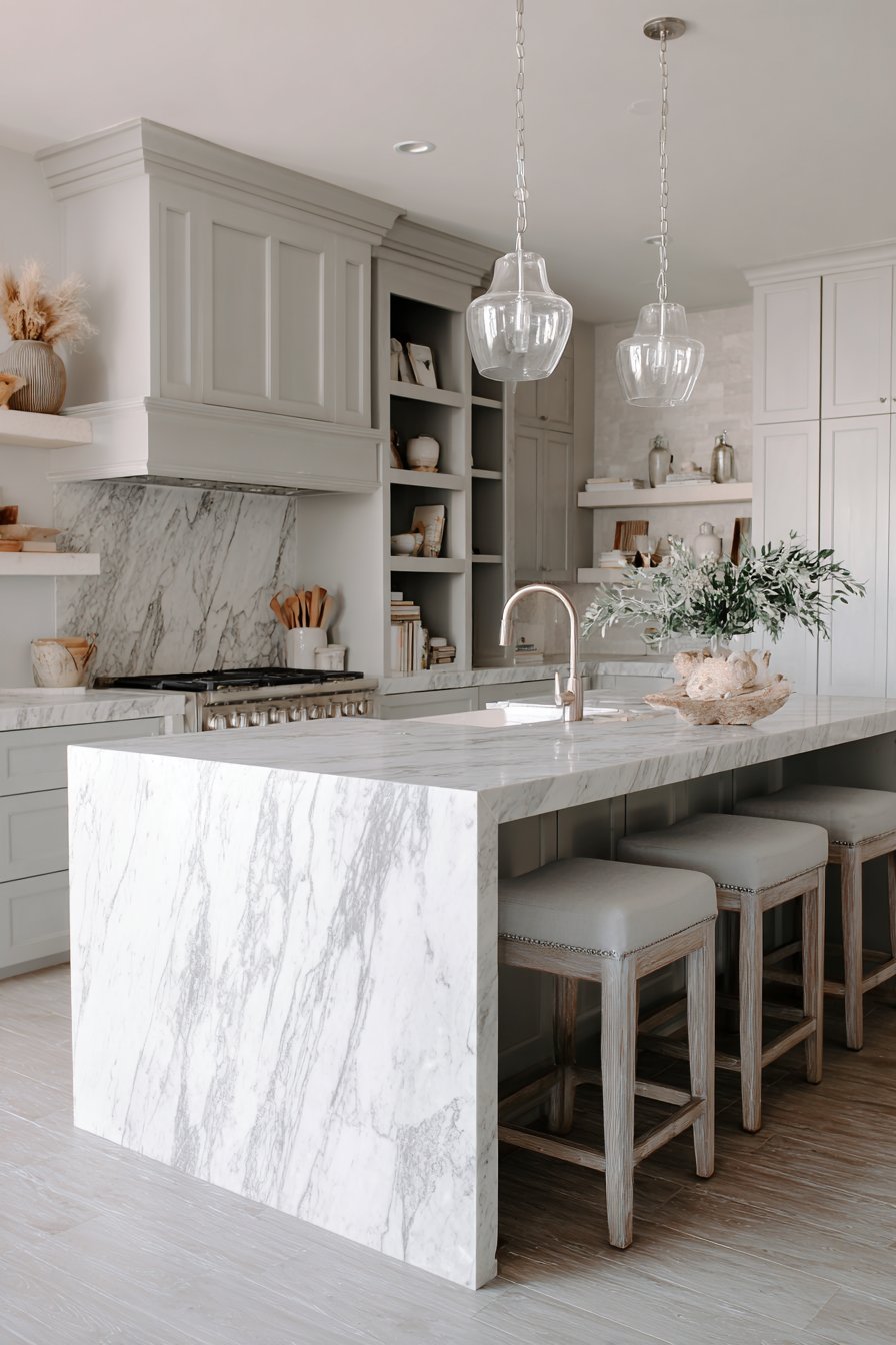 2. The Statement Island: Grey Waterfall Design as Centerpiece