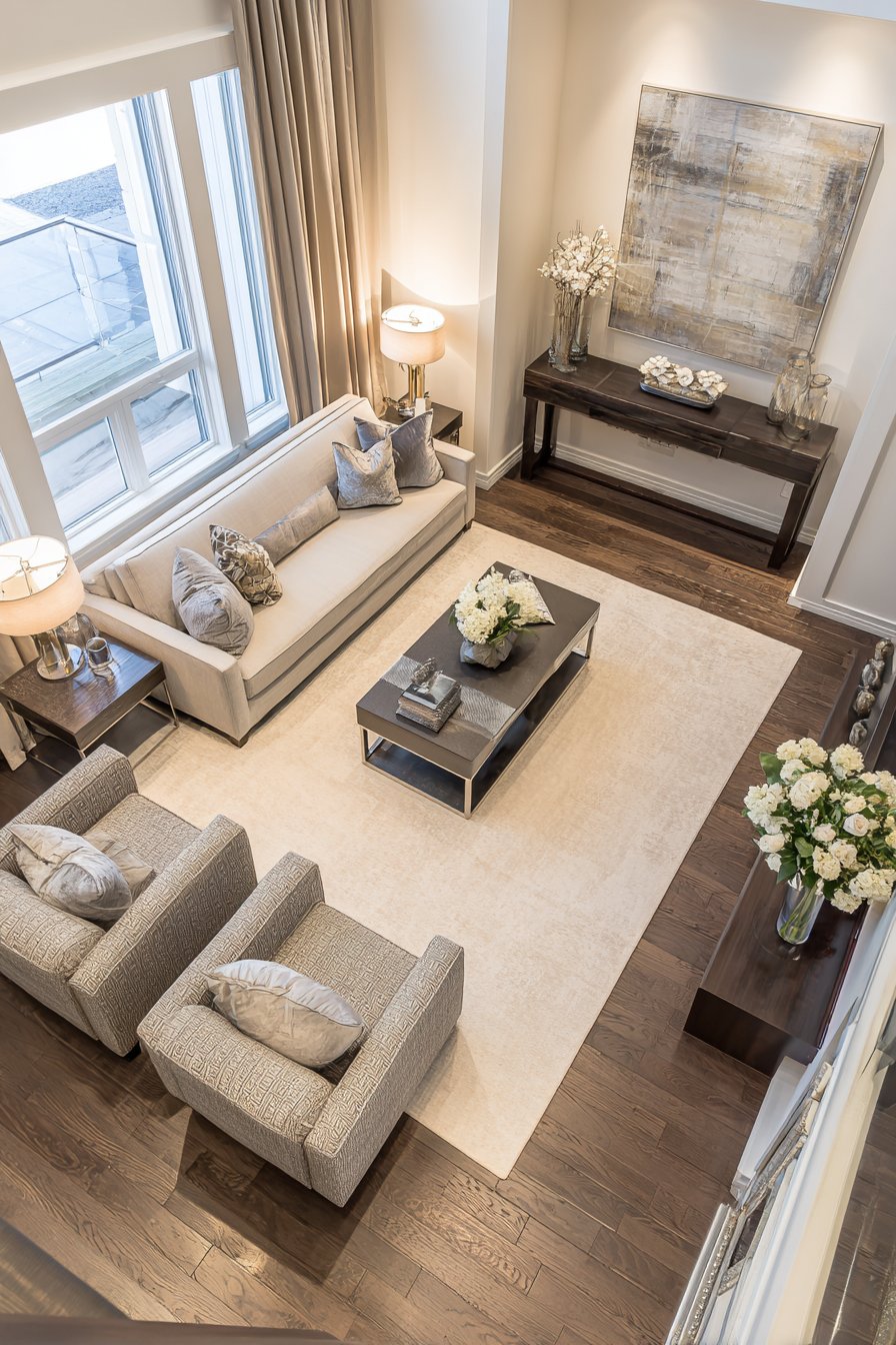 - Position sofas and chairs to face each other, creating natural conversation circles