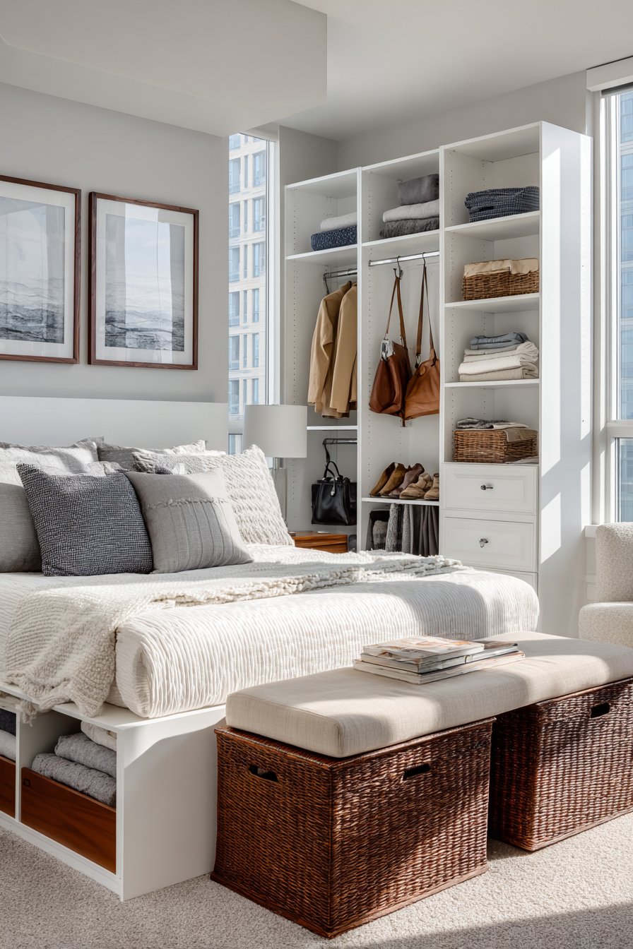 Under-bed storage provides hidden space for seasonal items and extra linens without consuming valuable floor area. Choose beds with built-in drawers or invest in rolling storage containers. This approach keeps less-used items accessible yet out of sight. Remember to measure your bed height before purchasing storage solutions.