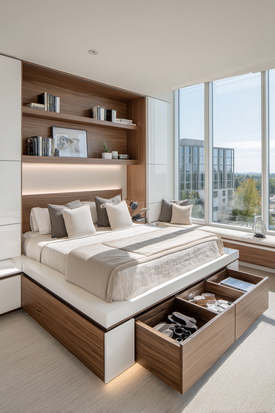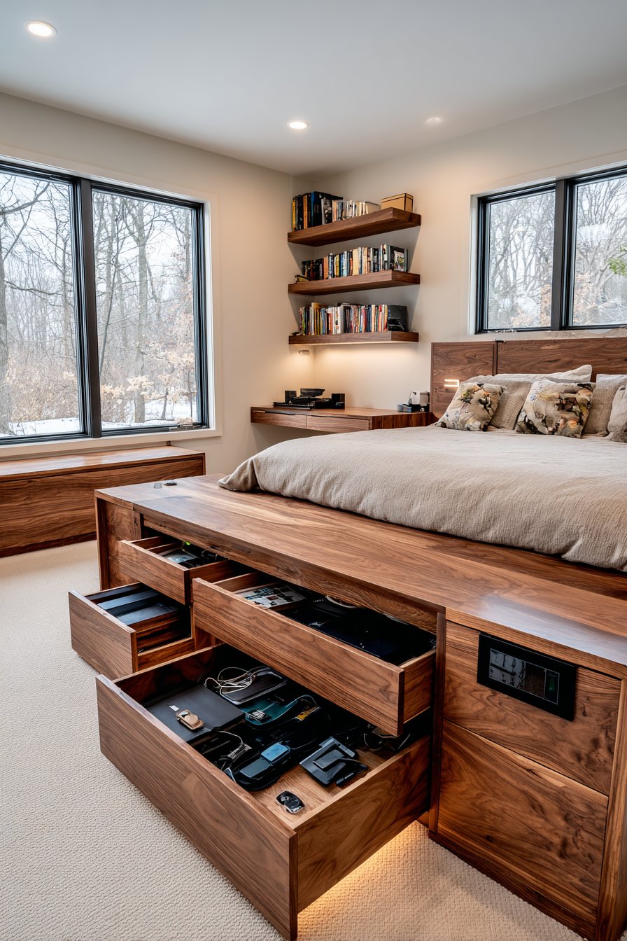 Platform beds with integrated storage drawers eliminate the need for separate dressers in smaller rooms. These beds provide substantial hidden storage for clothing, shoes, or extra bedding. Choose solid construction that withstands daily drawer use. Hydraulic lift beds offer even more storage but require careful measurement of ceiling height.