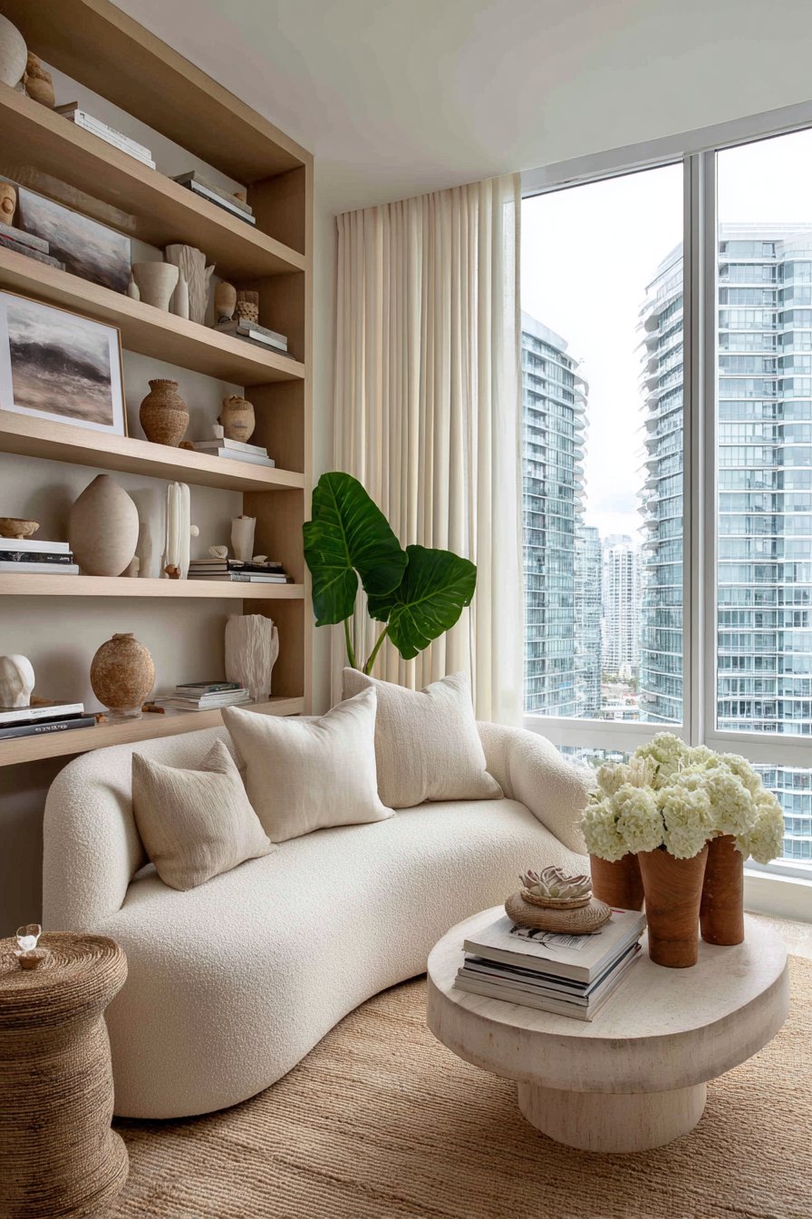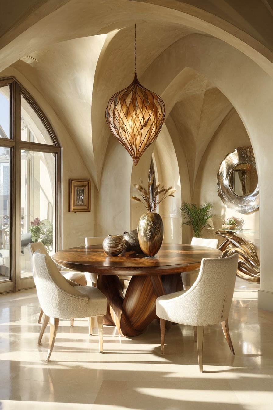 Furniture selections favor organic silhouettes over boxy constructions. Sofas with rounded arms, circular dining tables, and kidney-shaped coffee tables introduce movement without sacrificing functionality. Even smaller elements like rounded cabinet hardware, spherical pendant lights, and curved picture frames contribute to the overall aesthetic harmony.