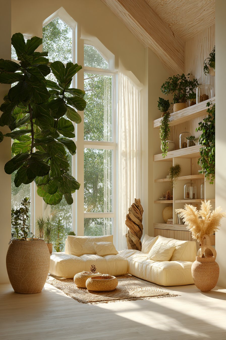 Large-scale plants make powerful architectural statements in 2026 interiors. Fiddle leaf figs, monstera deliciosa, and bird of paradise varieties provide dramatic vertical elements while softening hard surfaces. These statement plants anchor seating areas and fill empty corners with organic volume that feels both intentional and effortlessly natural.