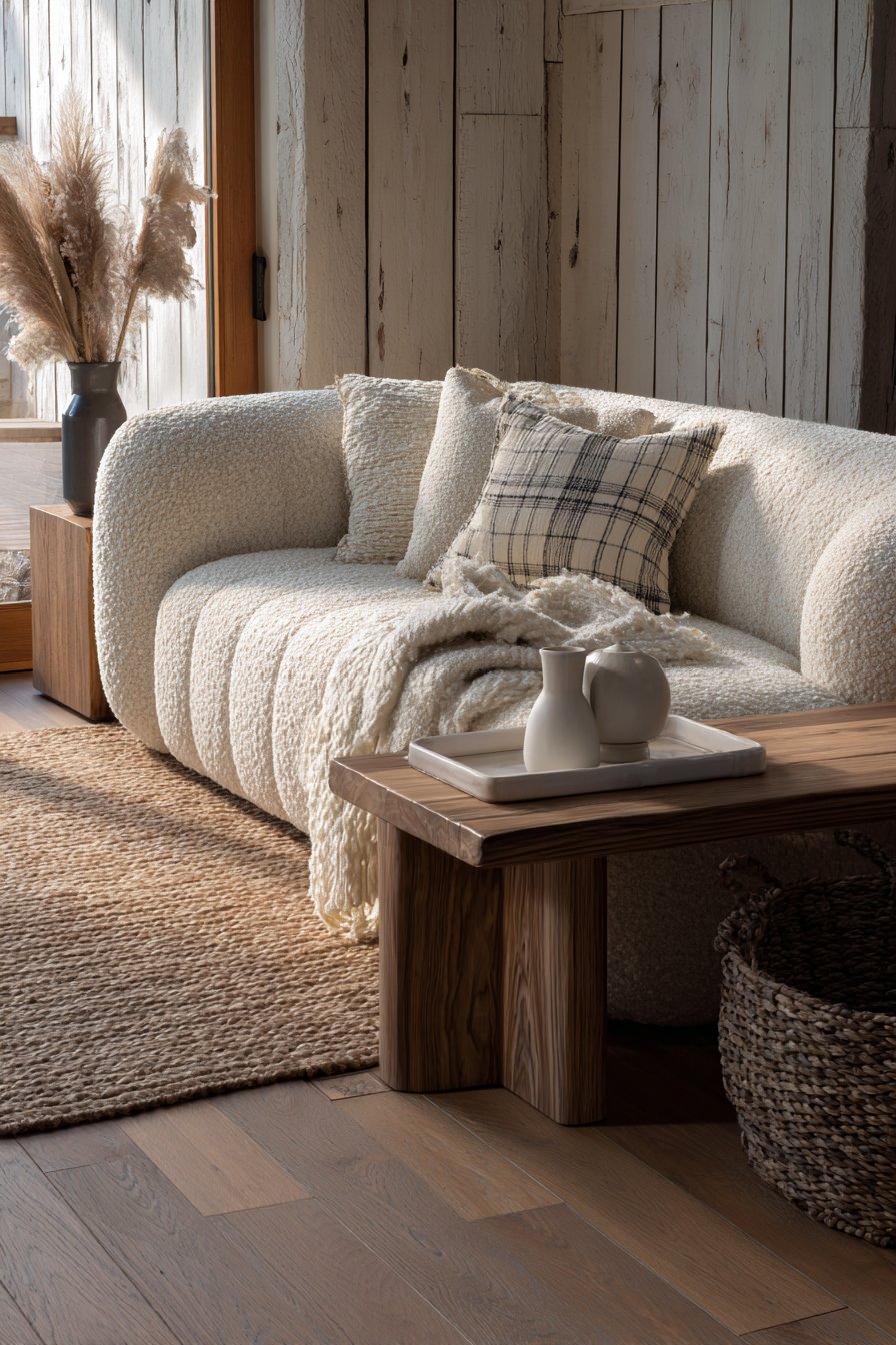 - Add tactile interest through materials like bouclé, linen, wool, and raw silk