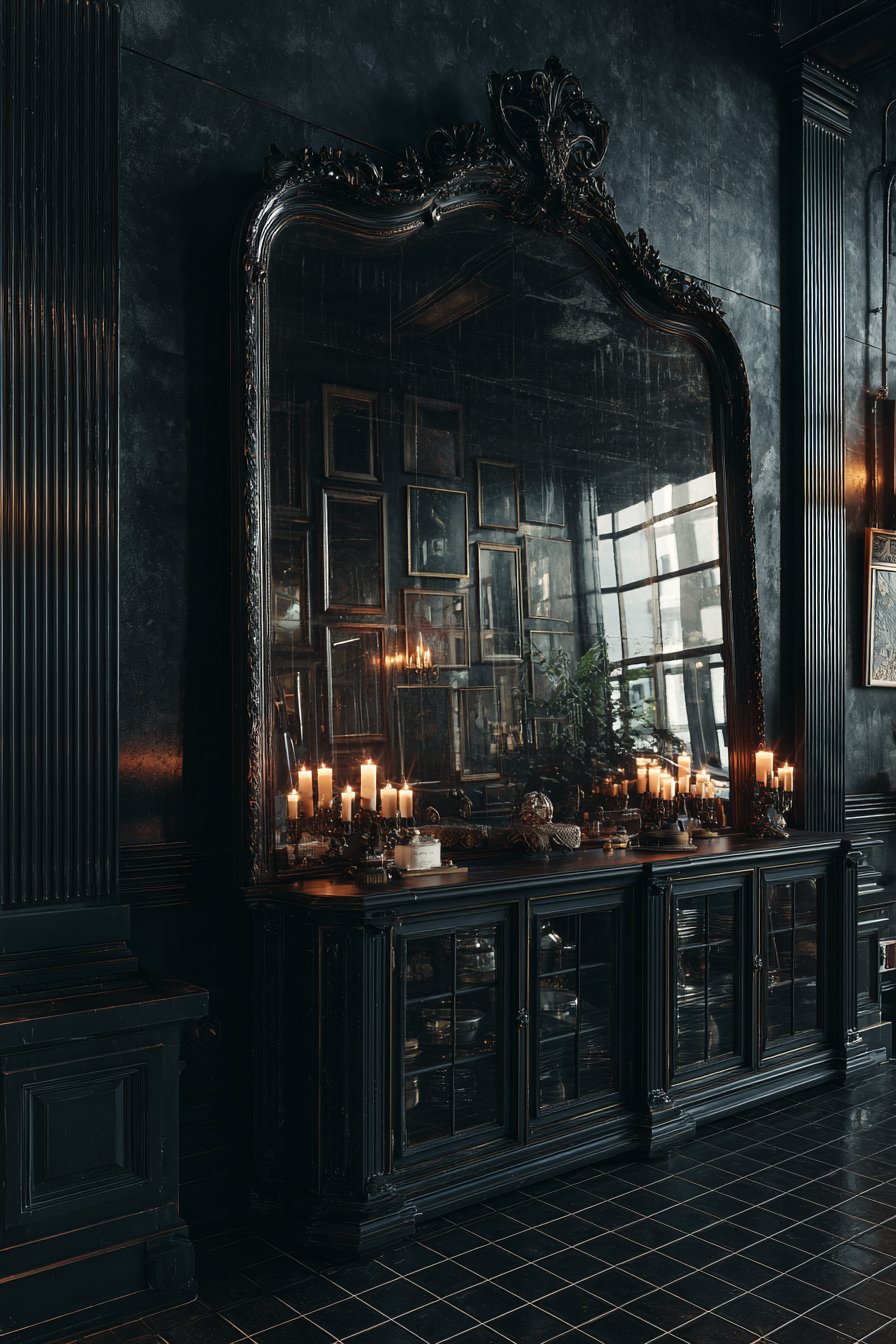 Antique or aged mirrors with dark frames fit perfectly within the moody design language. They add character while serving a functional purpose. Consider mirror shapes and styles that complement your room’s architectural features and furniture profiles.