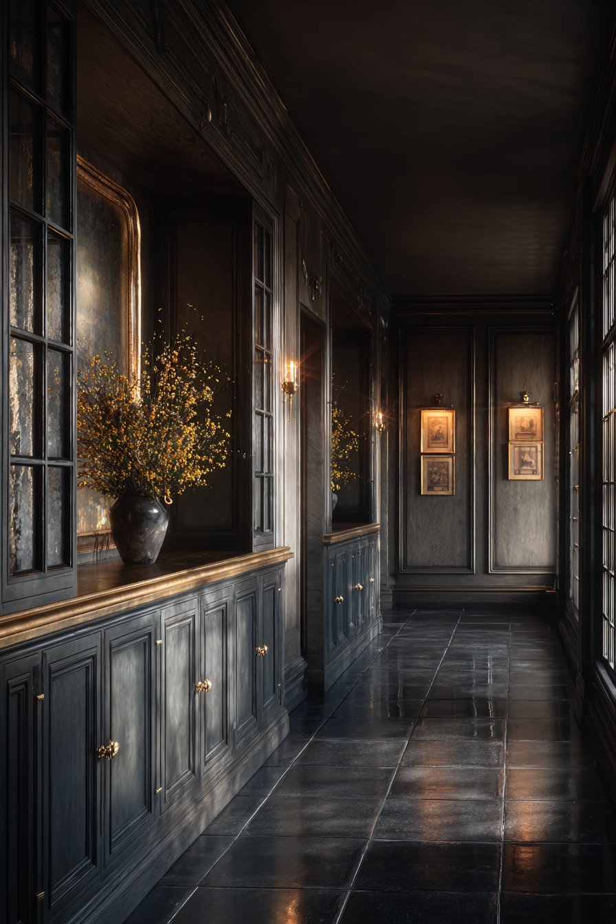 Reflective surfaces beyond traditional mirrors also enhance moody spaces effectively. Metallic finishes on furniture, glossy tiles in bathrooms, and glass accessories catch and bounce light. These elements create sparkle points that add interest without disrupting the overall dark aesthetic.