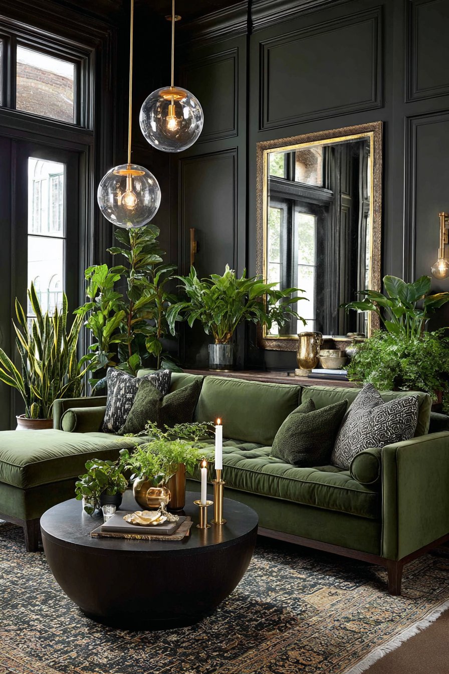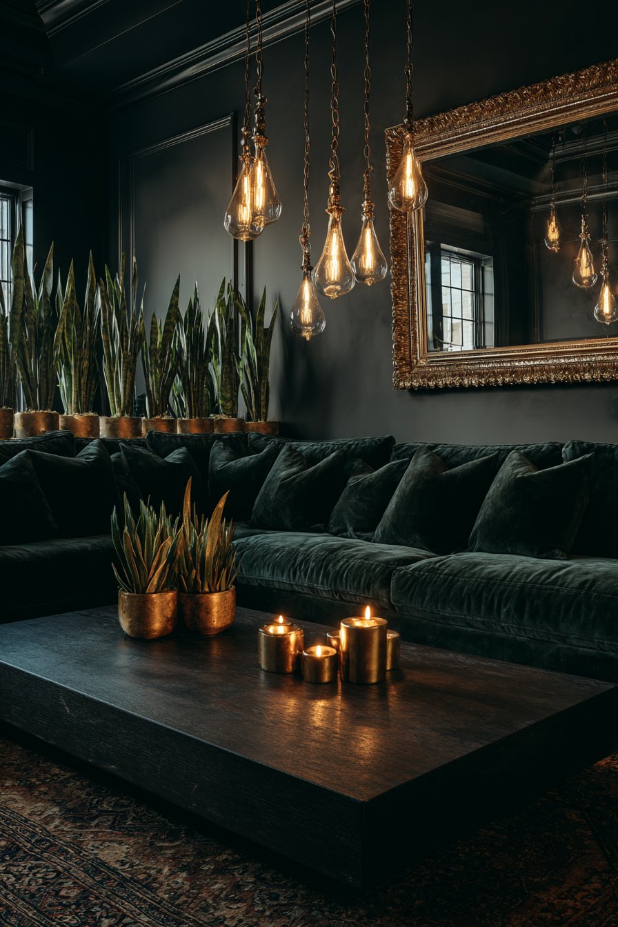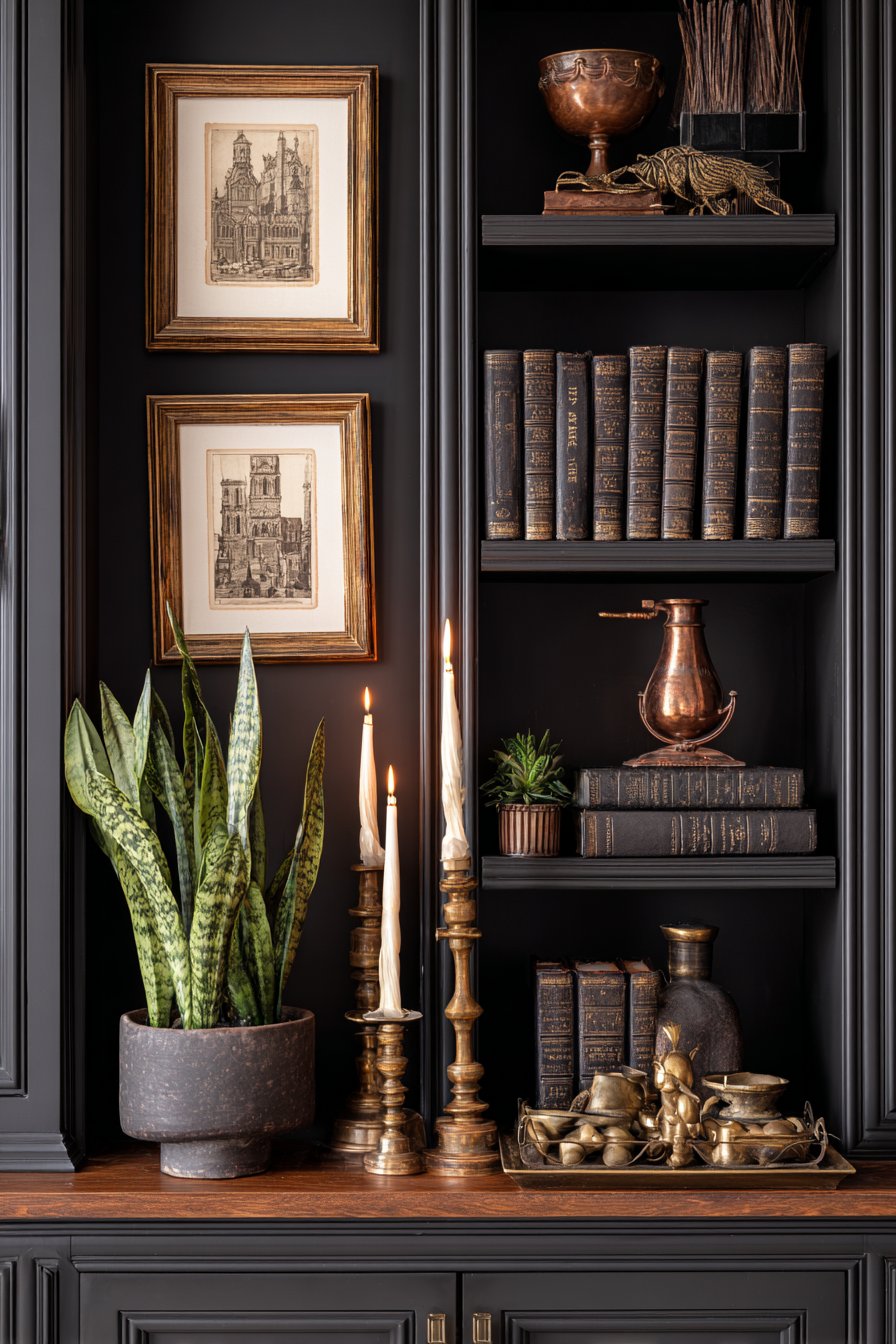 Plants bring life and energy to moody interiors through organic shapes and natural color. Deep green foliage complements dark walls while adding necessary contrast. Choose low-light tolerant varieties that thrive in these atmospheric conditions.