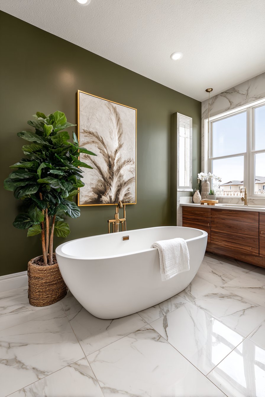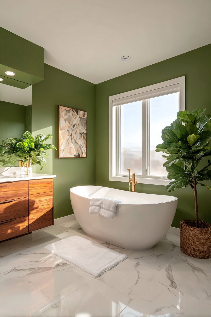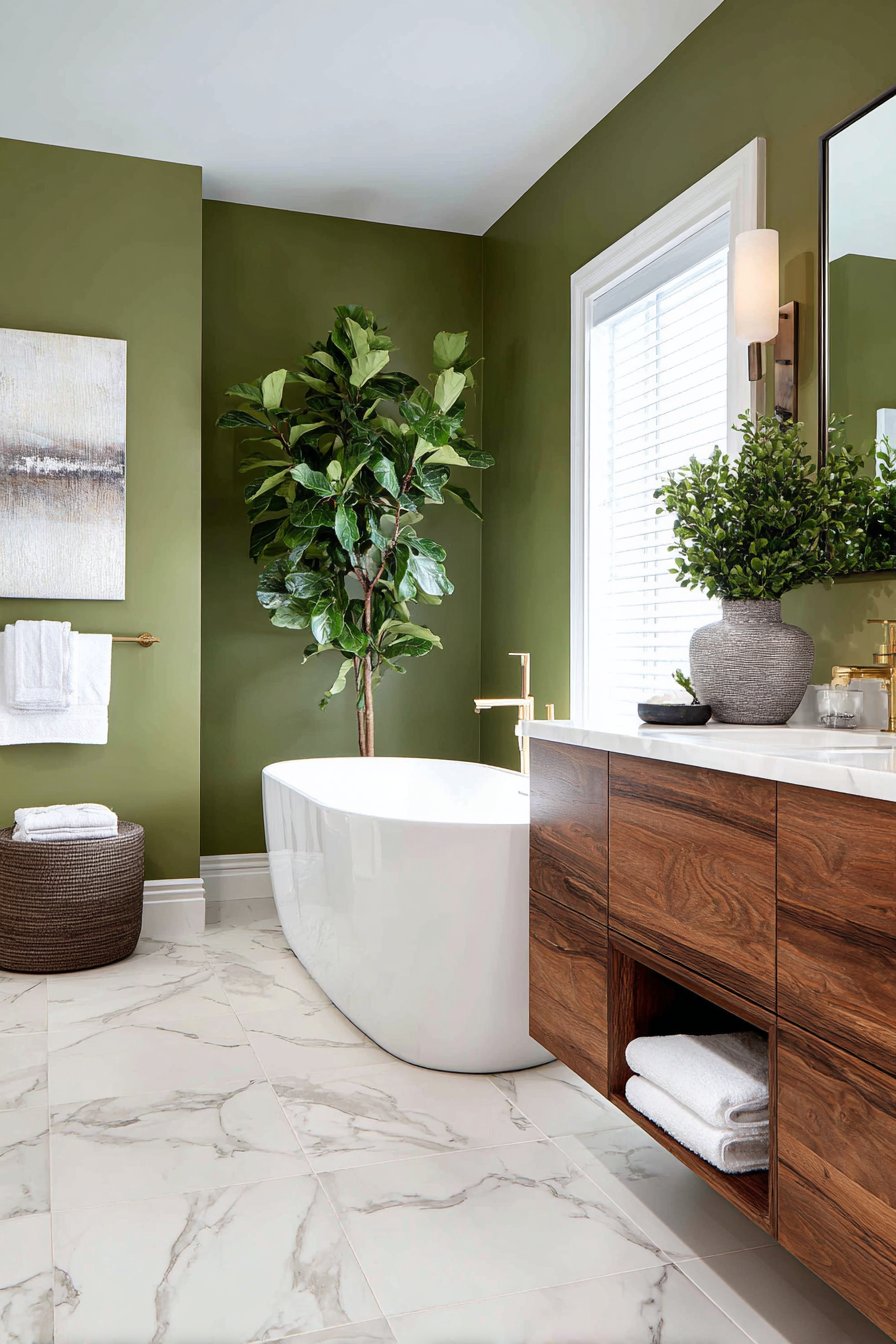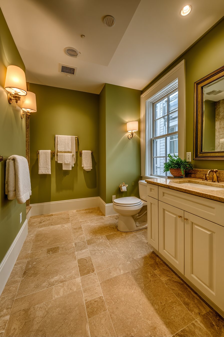 The specific undertones in olive green make it particularly effective for bathroom environments. Unlike brighter greens that can feel overwhelming in small spaces, olive’s muted earthiness provides visual interest without overstimulation. This sophisticated shade contains enough gray to feel grounded while retaining sufficient color to prevent the sterile feel that pure neutrals sometimes create.