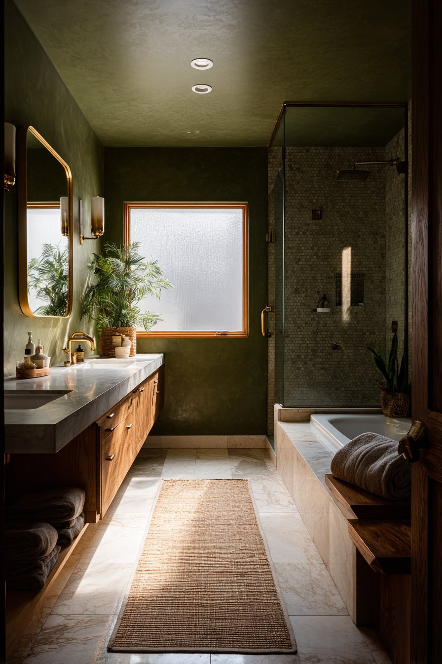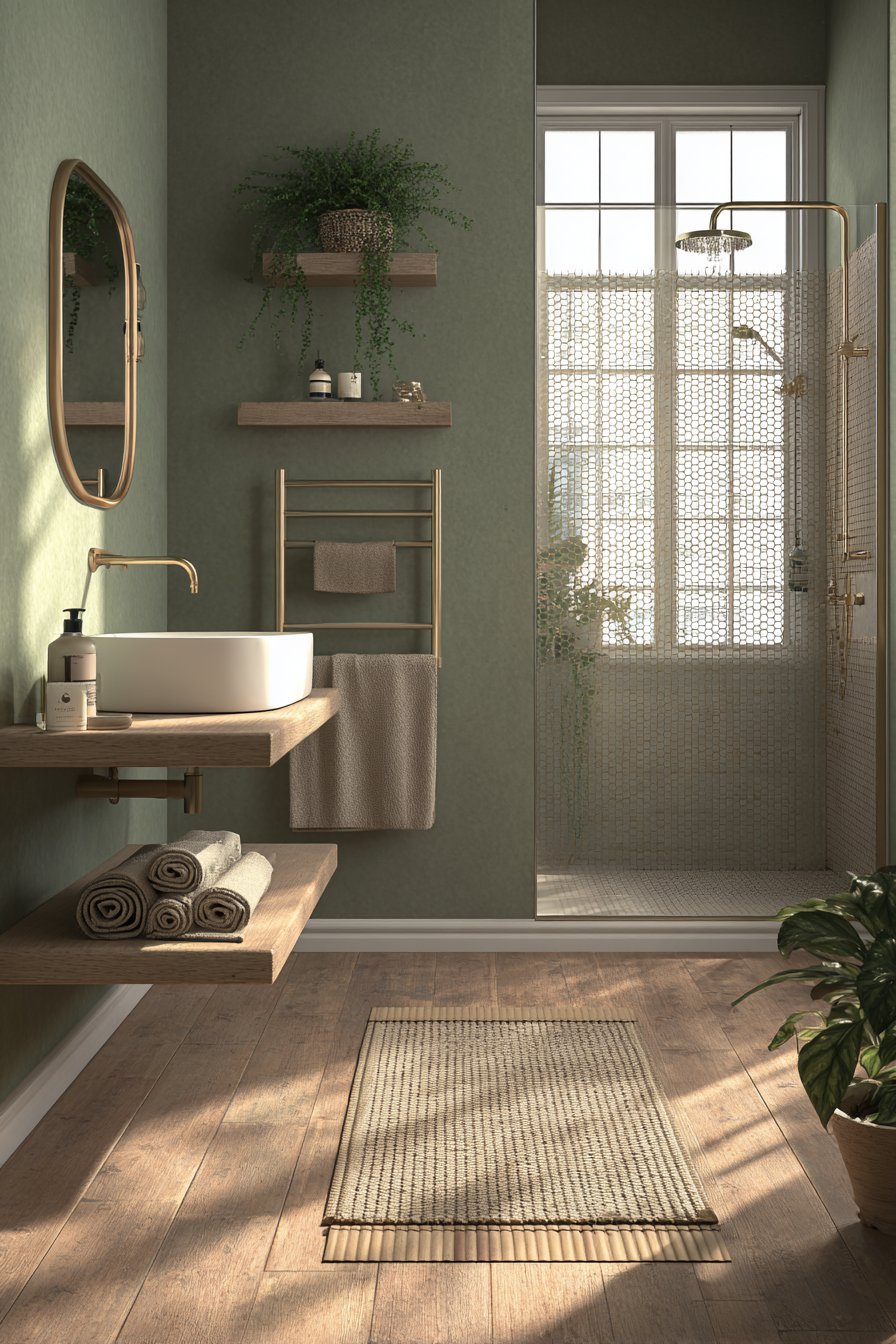Wood elements bring textural warmth that complements olive’s earthy character perfectly. Consider a wooden vanity with visible grain patterns, floating shelves in walnut or oak, or even a teak bath mat. These natural materials create dialogue with the green tones, establishing a cohesive design narrative that feels intentional and refined.