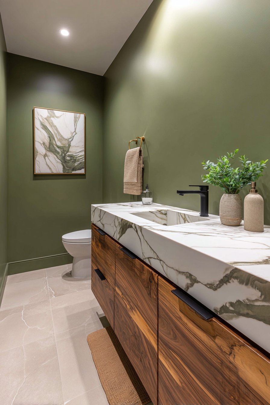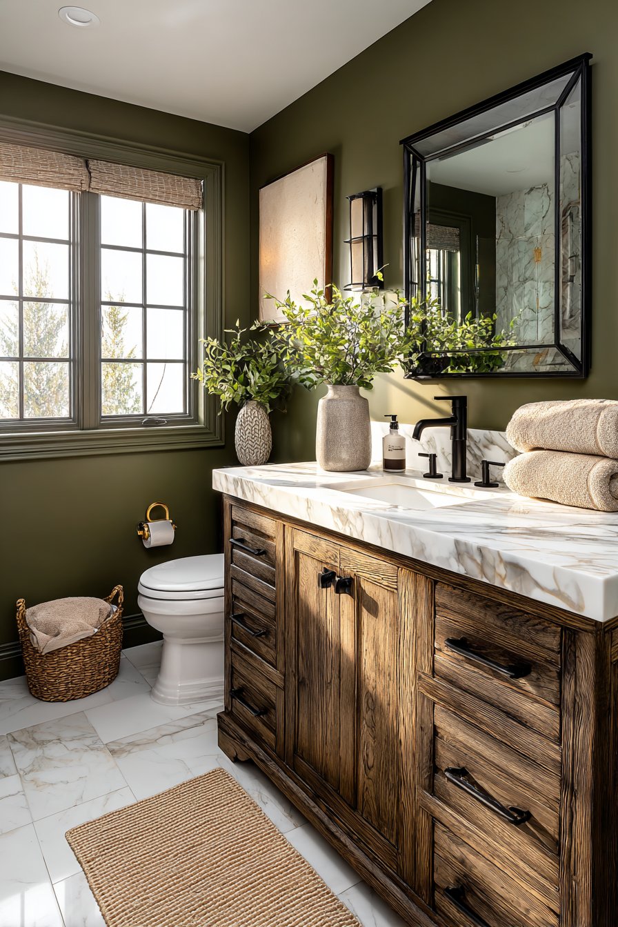 The success of an olive green bathroom depends heavily on the materials you select as companions. Natural stone, particularly marble and travertine, creates a luxurious contrast while sharing organic origins. The veining in marble introduces movement and visual complexity that prevents olive from feeling flat or one-dimensional.