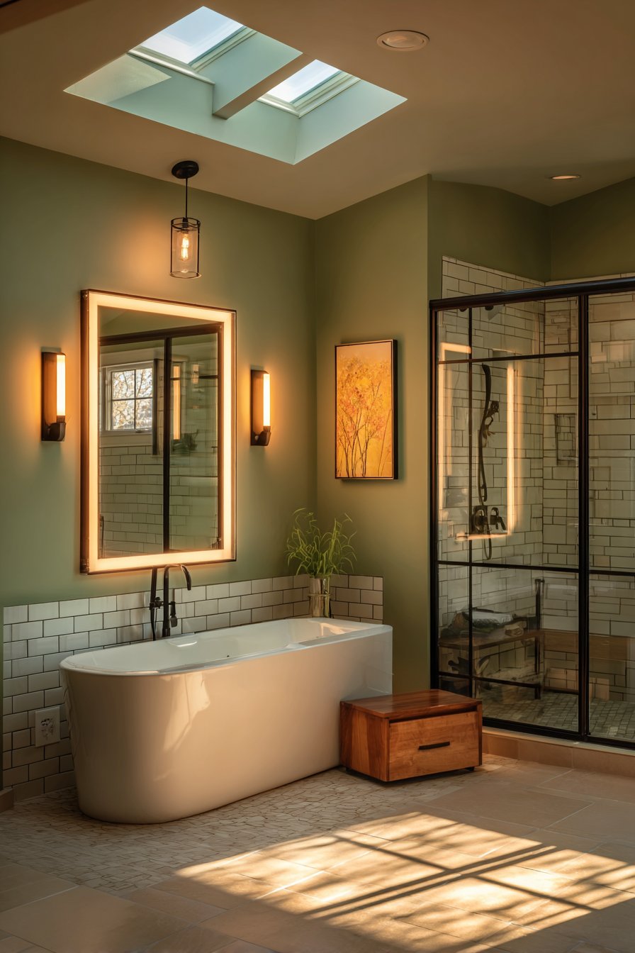 The proportion of olive to neutral tones determines whether your bathroom feels intimate or spacious. A general rule suggests using the 60-30-10 ratio: 60% neutral, 30% olive green, and 10% accent color. This balance ensures the green enhances rather than overwhelms, creating harmony that feels professionally designed.