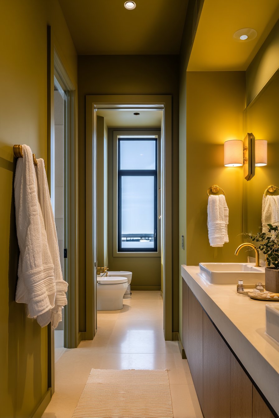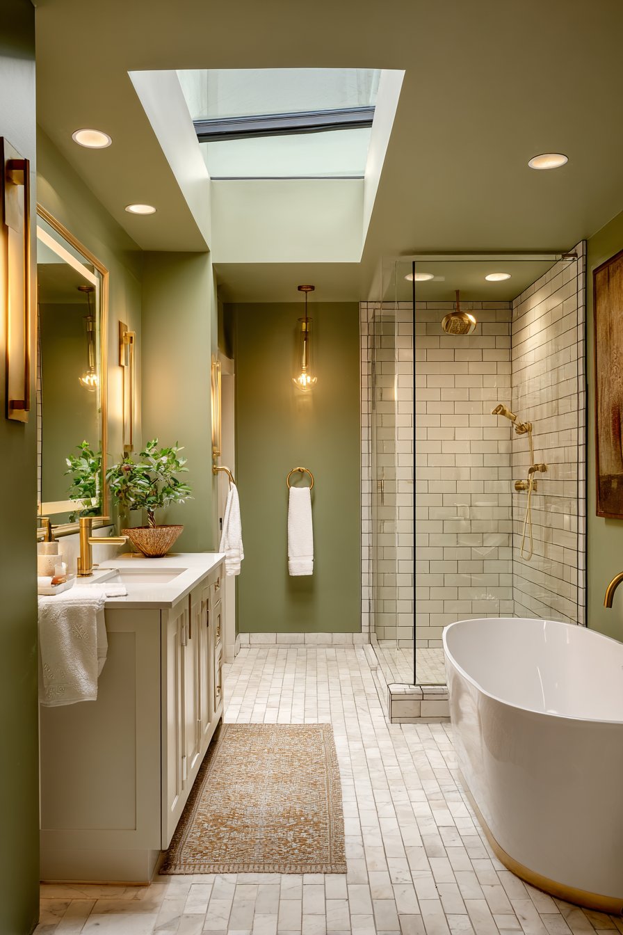 - Use lighter olive tints on ceilings to maintain airiness in smaller bathrooms