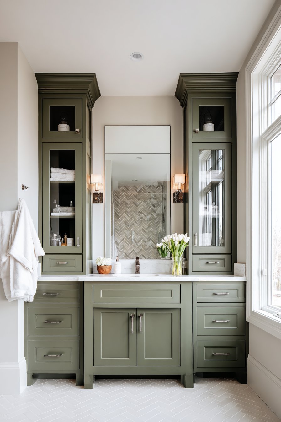Olive green serves as an excellent foundation for multiple color combinations, each creating distinct moods. Pairing olive with warm whites and creams establishes a serene, spa-like environment that feels both fresh and grounded. This classic combination allows the green to shine while maintaining brightness and cleanliness essential for bathroom spaces.