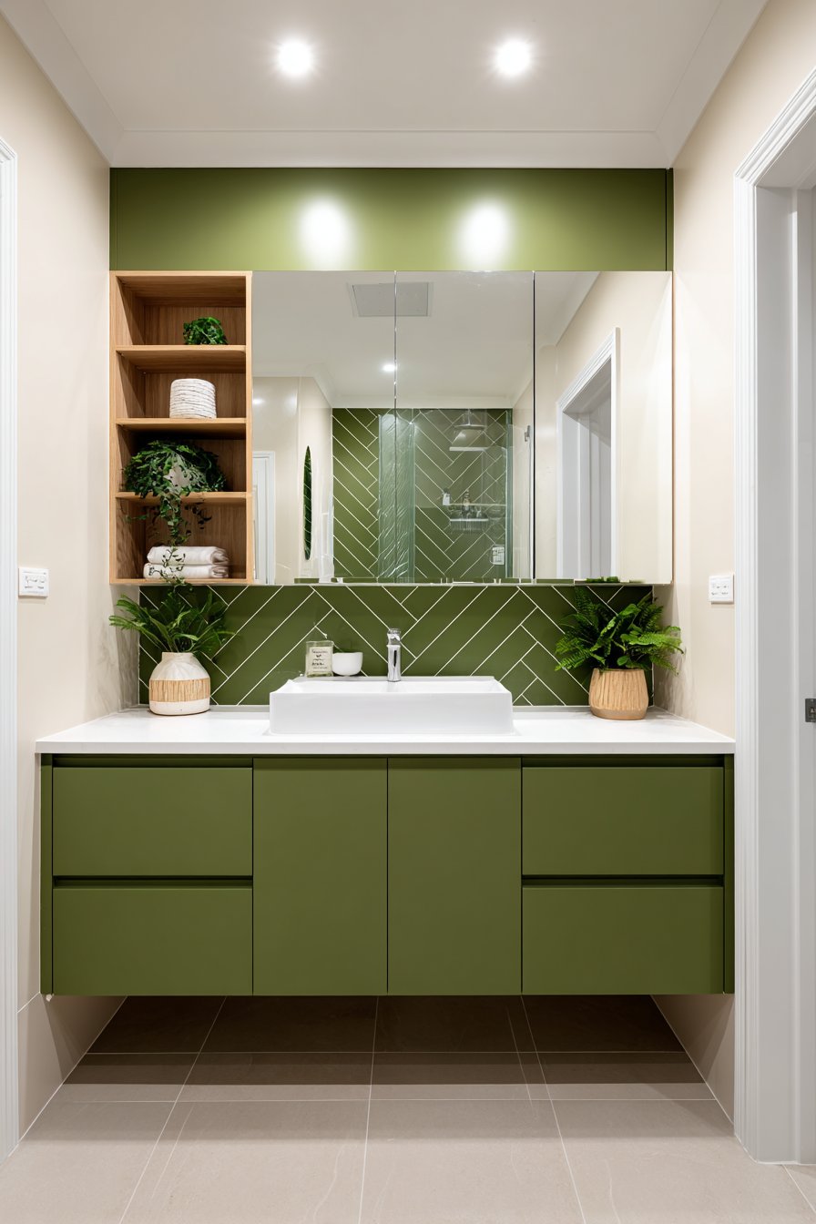 For smaller bathrooms, strategic placement prevents the space from feeling cramped. Consider an accent wall behind the vanity or in the shower area rather than painting all surfaces. This approach provides color impact while maintaining visual openness. Alternatively, use olive green tiles as a backsplash or wainscoting detail for a more measured introduction of color.