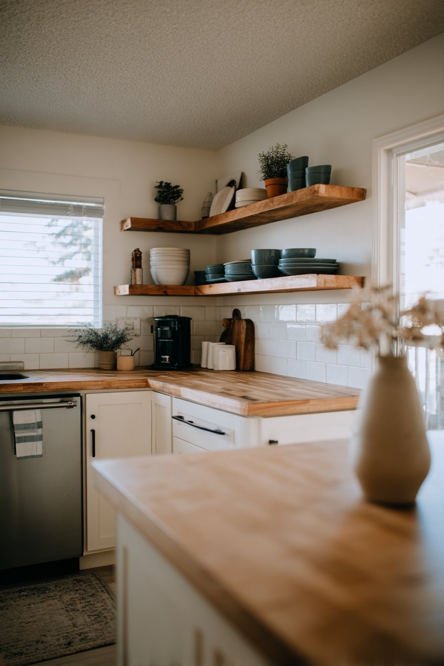 - Install floating shelves above countertops for frequently used dishes and spices