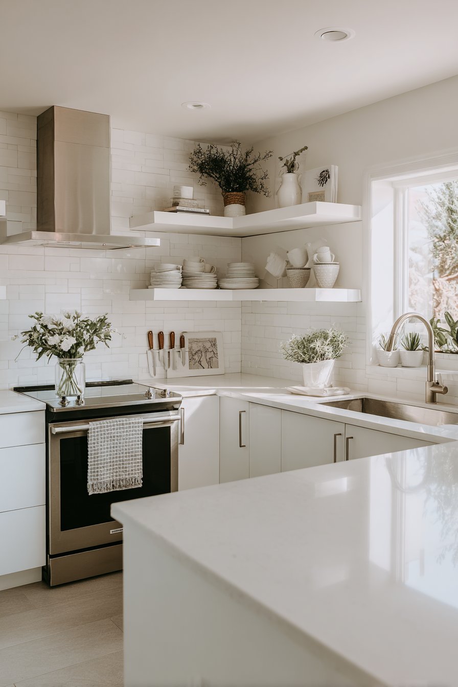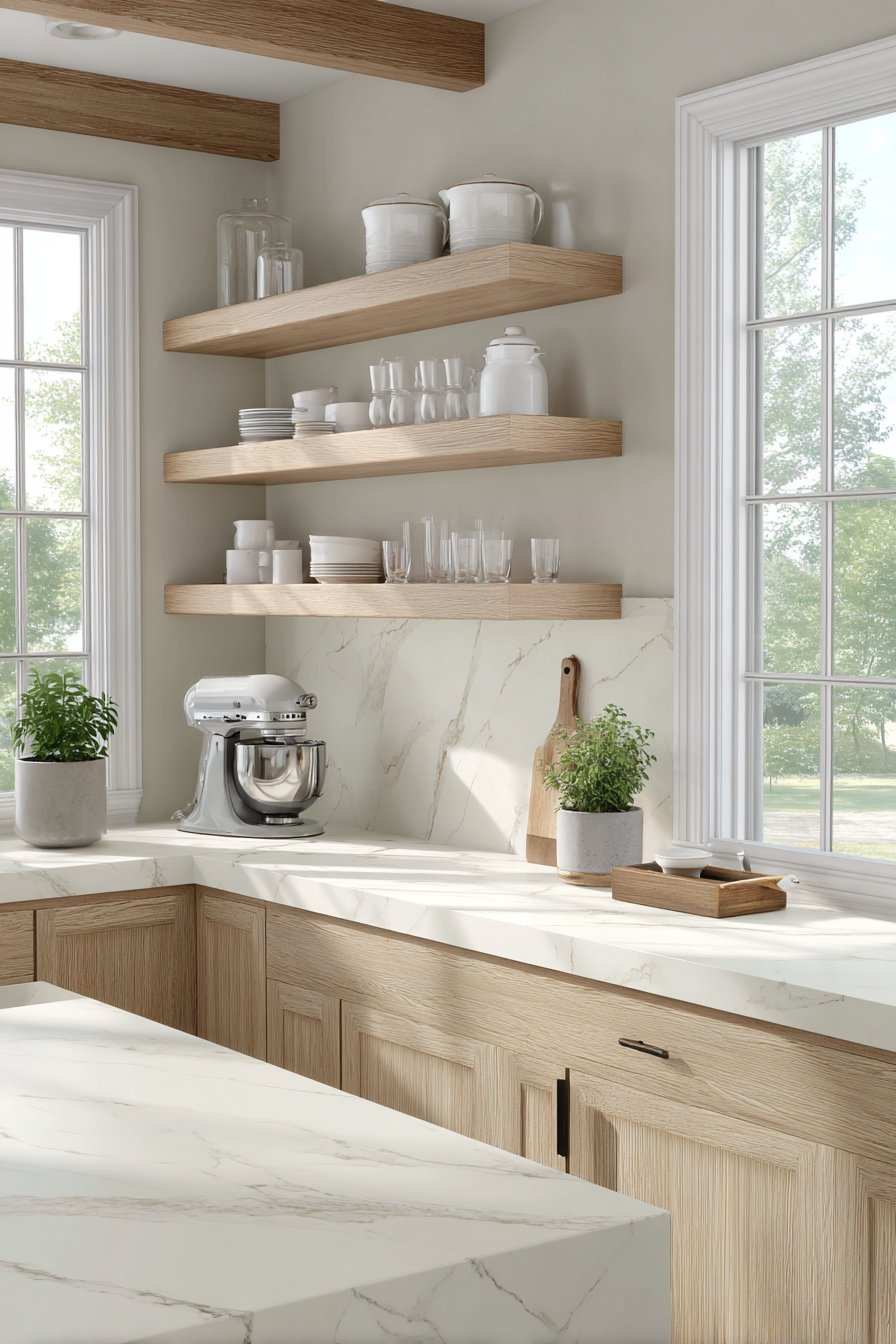 Open shelving creates an airy feel while providing easy access to frequently used items. Display attractive dishware and glassware on floating shelves to combine storage with decoration. This approach makes your kitchen feel larger while keeping essentials within reach. Consider the visual weight of items and arrange them thoughtfully to avoid a cluttered appearance.