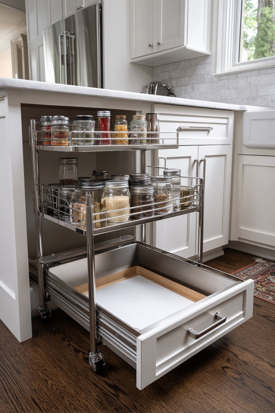 Toe-kick drawers utilize the recessed space beneath lower cabinets for flat items. These shallow drawers are perfect for baking sheets, cutting boards, and serving platters. Pull-out spice racks fit into narrow spaces between appliances or at the end of cabinet runs. These slim solutions make use of every available inch.