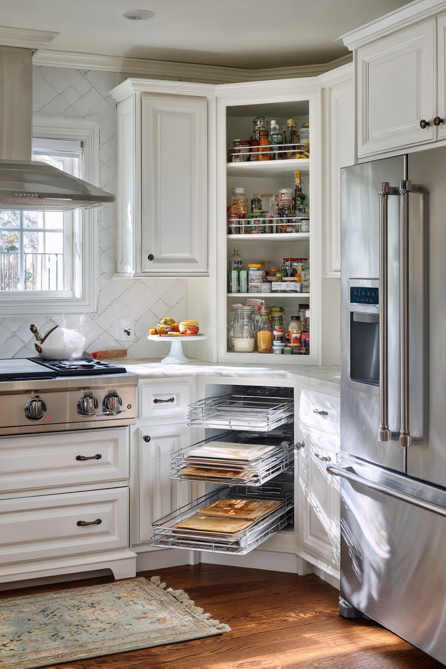 Corner spaces notoriously waste cabinet volume with hard-to-reach depths. Lazy Susans and corner pull-out systems bring items to you, eliminating the dreaded black hole effect. Installing narrow rolling carts that slide between appliances creates additional pantry space. The philosophy is simple: no space goes unused.