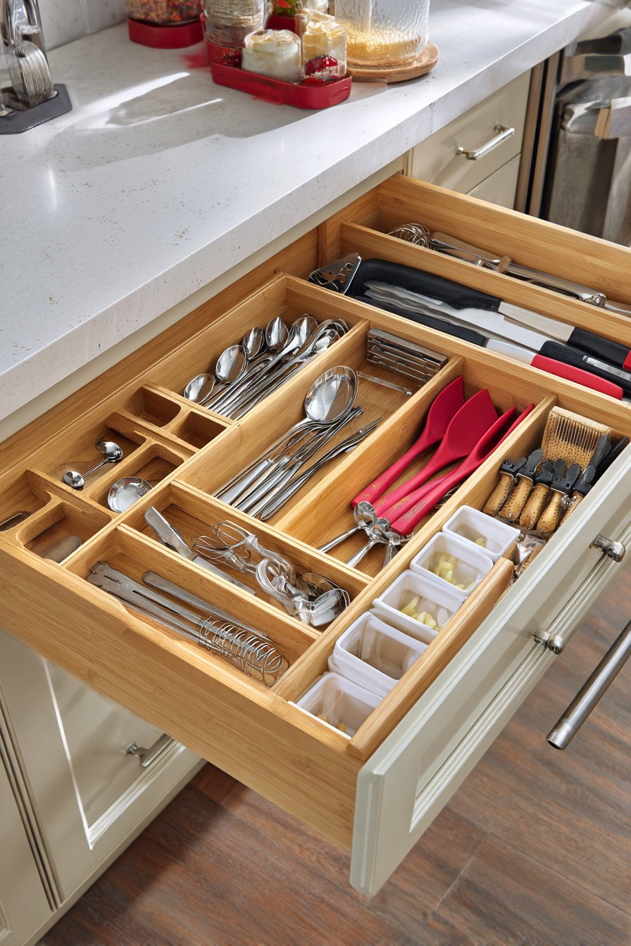 - Use drawer dividers to separate and organize utensils and gadgets