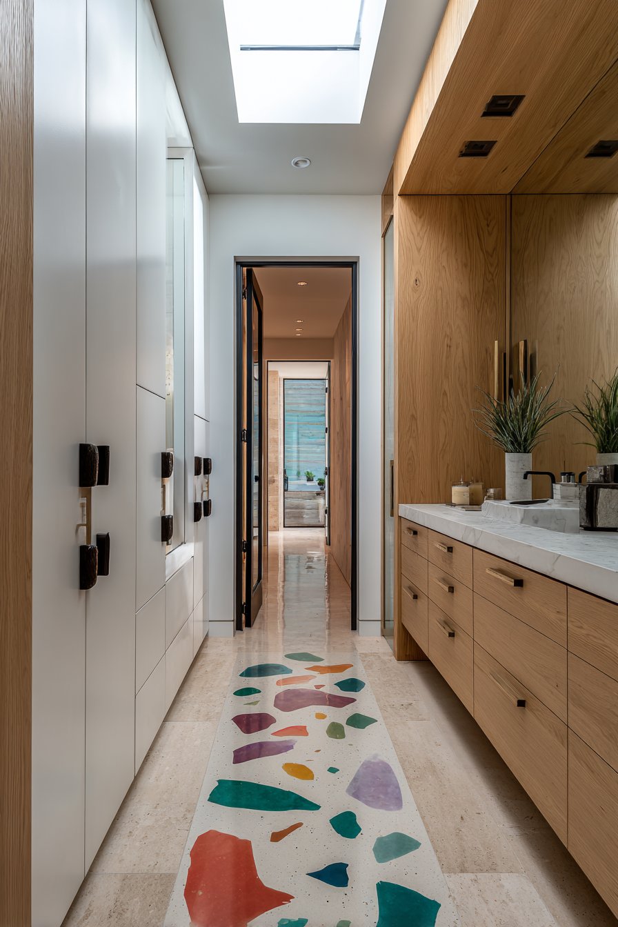 - Mix terrazzo with sleek fixtures for cohesive modern look