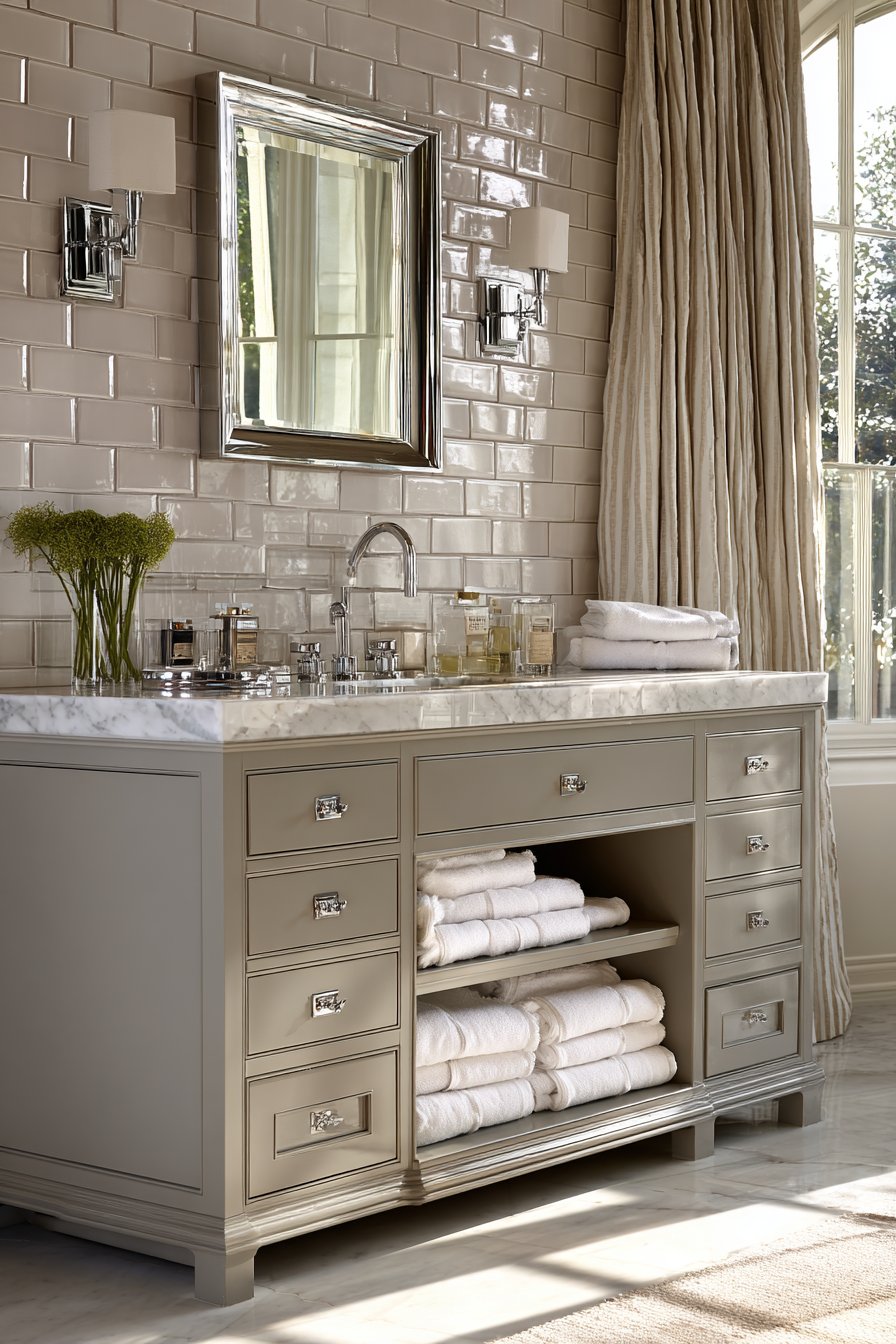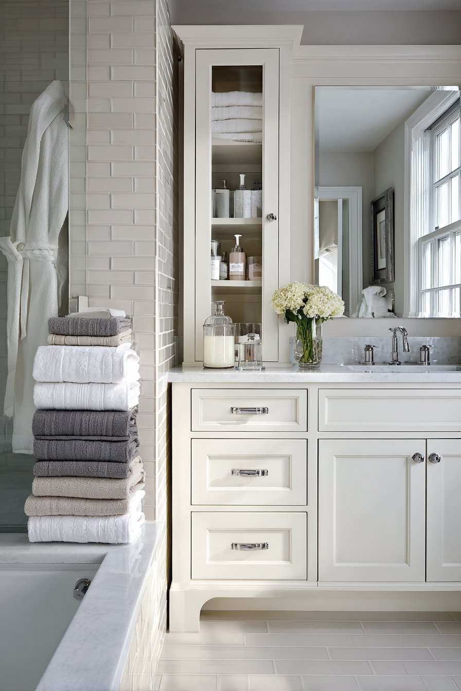 Built-in storage designed with classic proportions and simple detailing ensures your bathroom remains functional and uncluttered for years. Traditional vanities with Shaker-style doors, recessed medicine cabinets, and linen closets provide necessary storage without calling attention to themselves. These practical elements integrate seamlessly into timeless design while preventing the bathroom from feeling dated as storage trends evolve.
