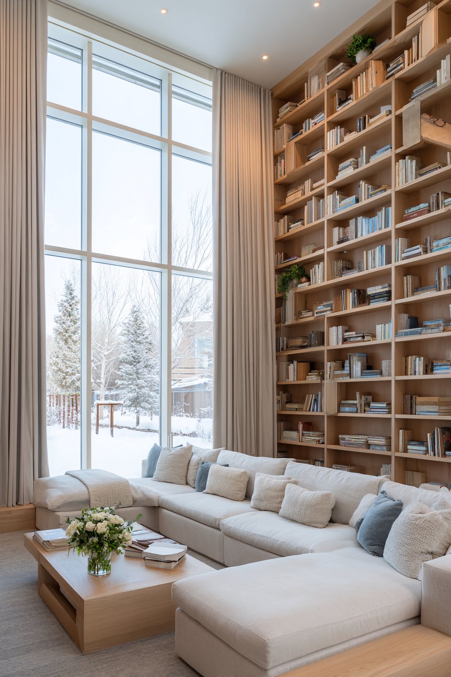 Floor-to-ceiling shelving transforms blank walls into productive storage while creating impressive architectural features. These towering units draw eyes upward, making standard 8-foot ceilings appear taller while providing exponentially more storage than conventional bookcases. The vertical emphasis creates a dramatic visual impact that low, horizontal furniture cannot match.