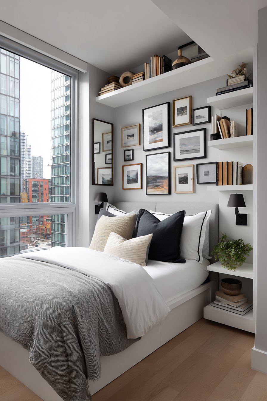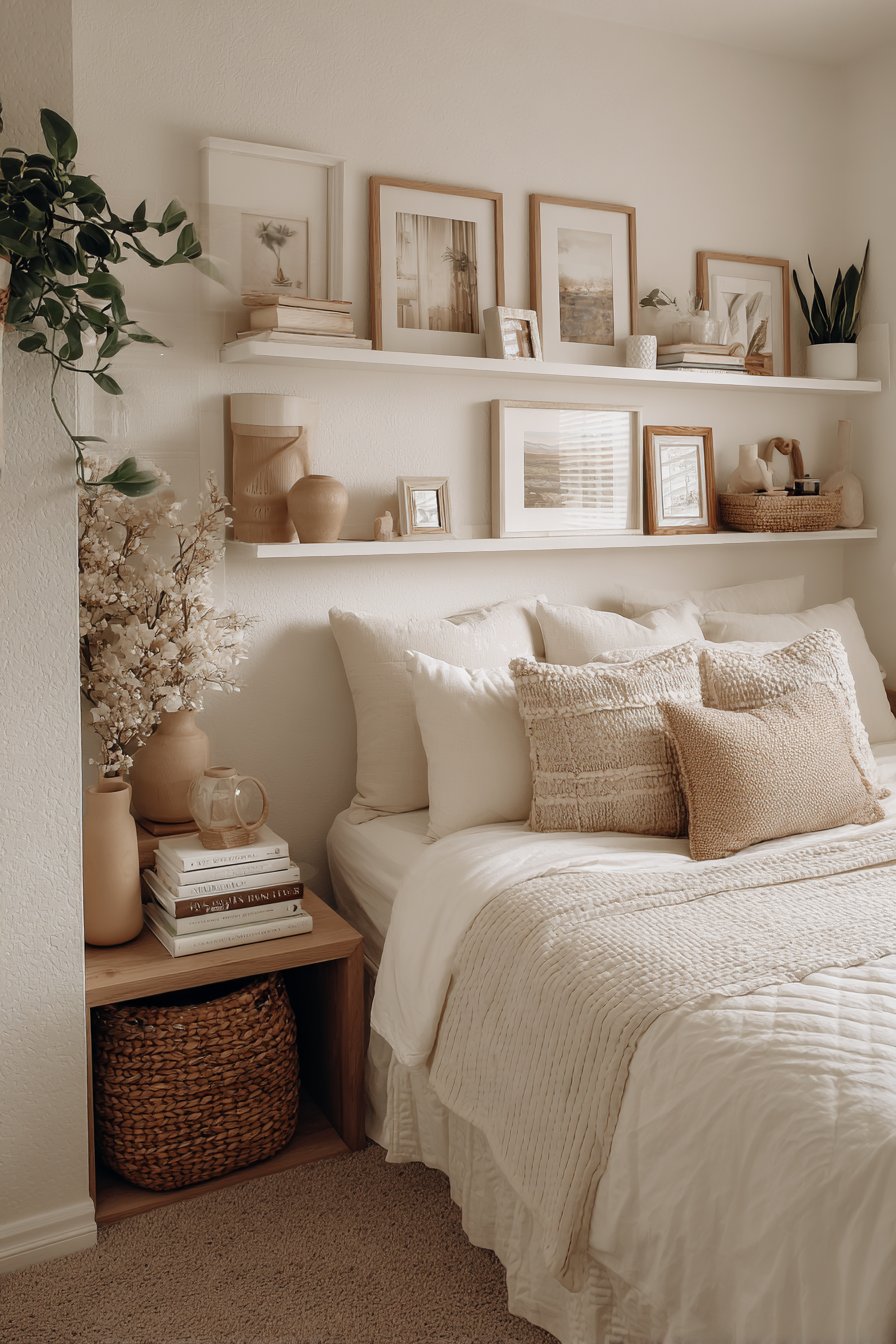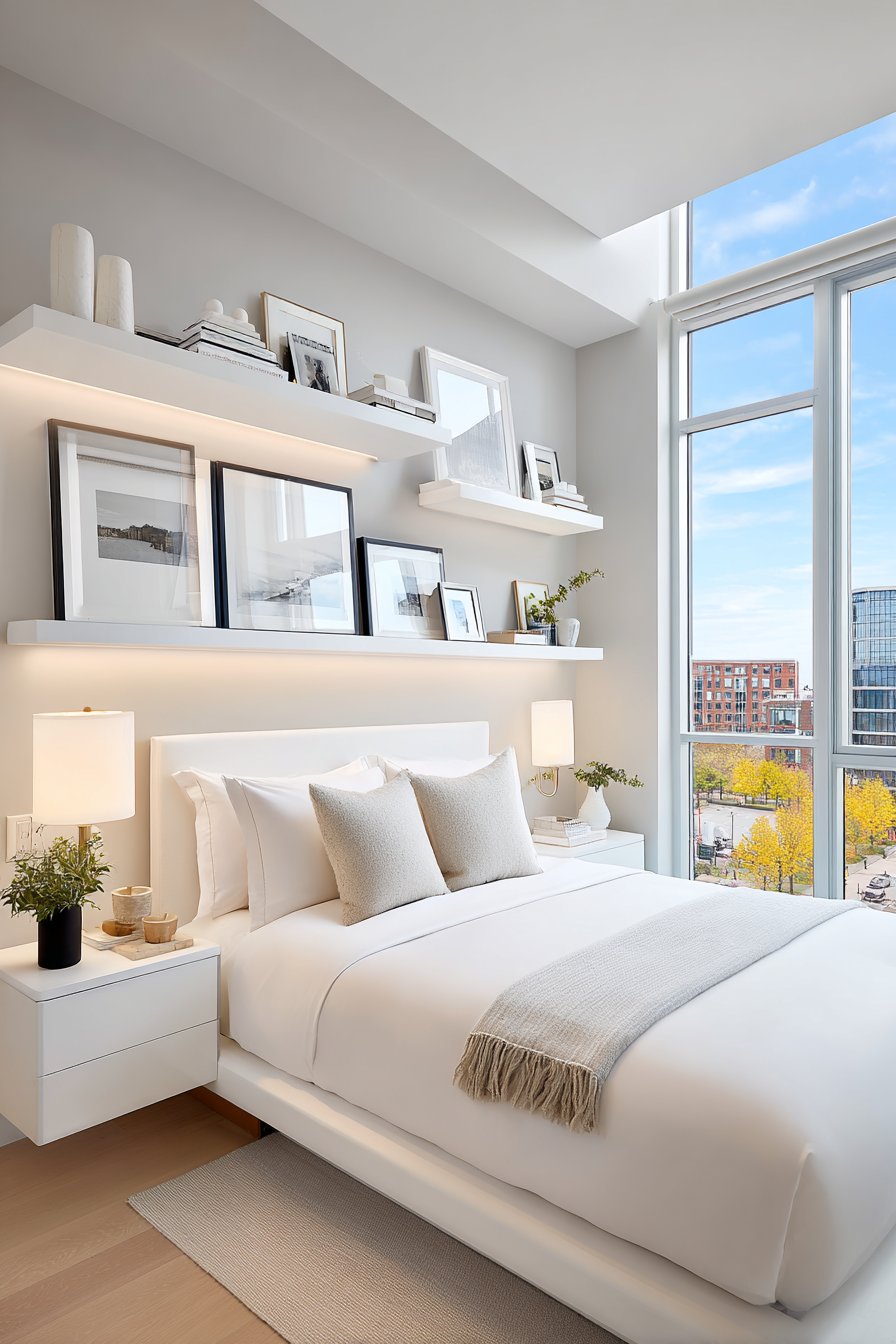 Small bedrooms demand creative storage solutions that don’t consume precious floor space. Wall-mounted shelving above and around your white bed frame creates functional storage while drawing the eye upward, making ceilings appear higher. This vertical approach transforms otherwise wasted wall space into valuable real estate for books, plants, and decorative objects.