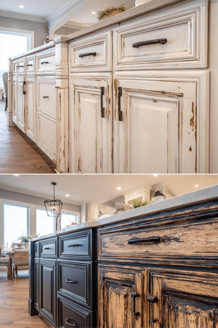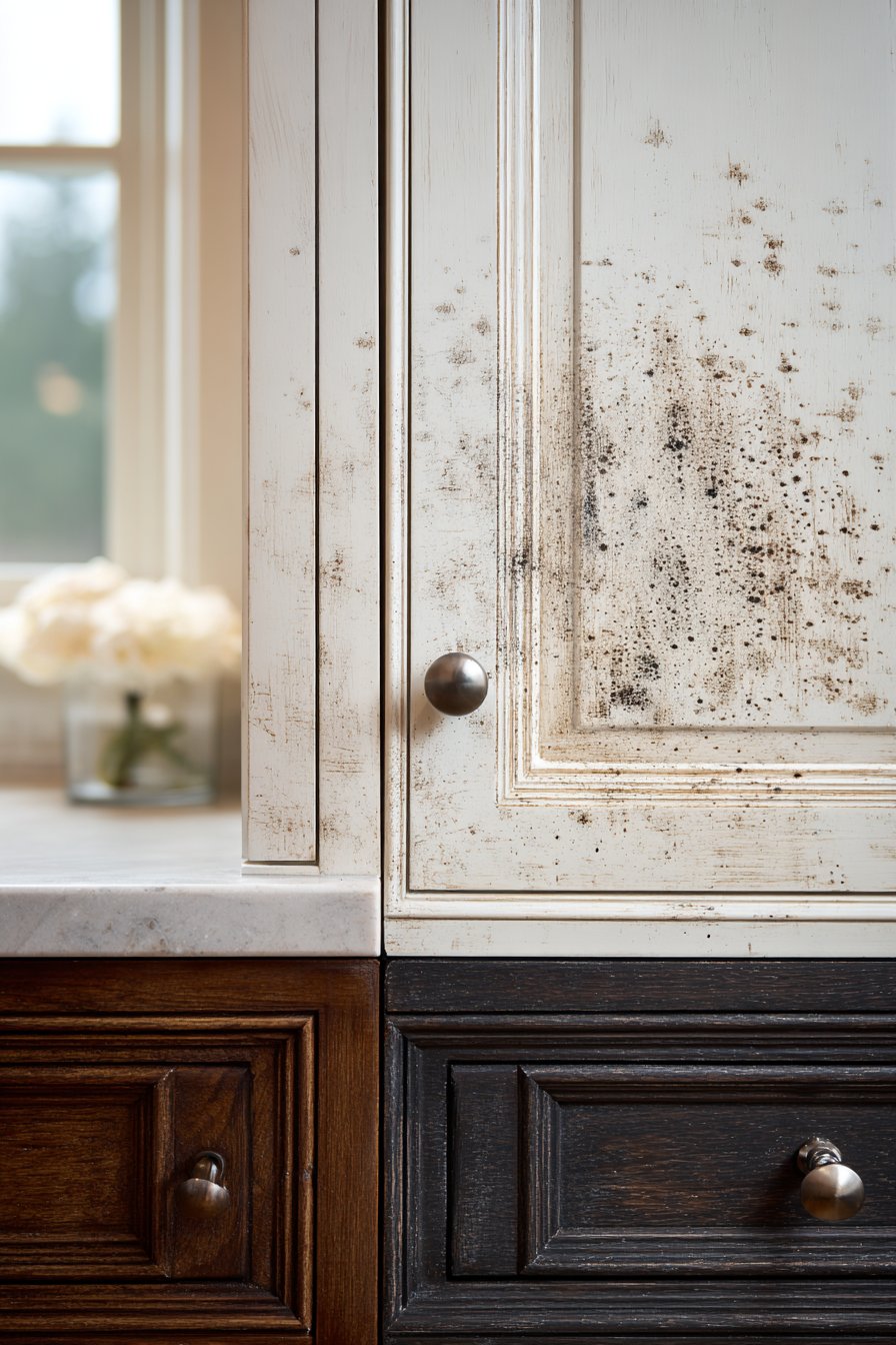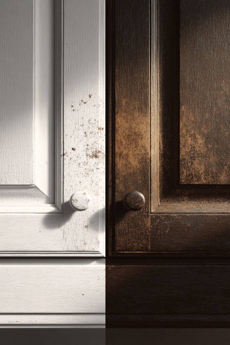 Dark cabinets reveal wear through finish deterioration rather than color change. Scratches and chips become highly visible as they expose lighter wood or substrate beneath. The protective topcoat on dark cabinets shows wear patterns more obviously than on white surfaces. However, dark stains rarely yellow, maintaining their intended color for decades with proper care.