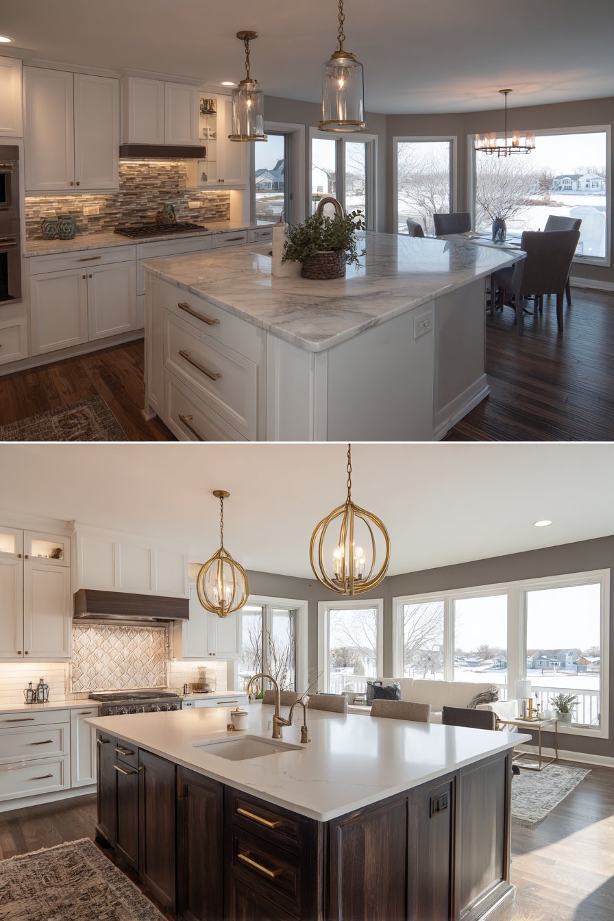 Mixing both cabinet colors in two-tone designs offers the best of both worlds. Island cabinets in dark finishes paired with white perimeter cabinets create dynamic visual interest. This approach allows homeowners to enjoy the dramatic appeal of dark wood while maintaining the brightness and versatility of white surfaces. Two-tone designs require careful planning to avoid looking disjointed.