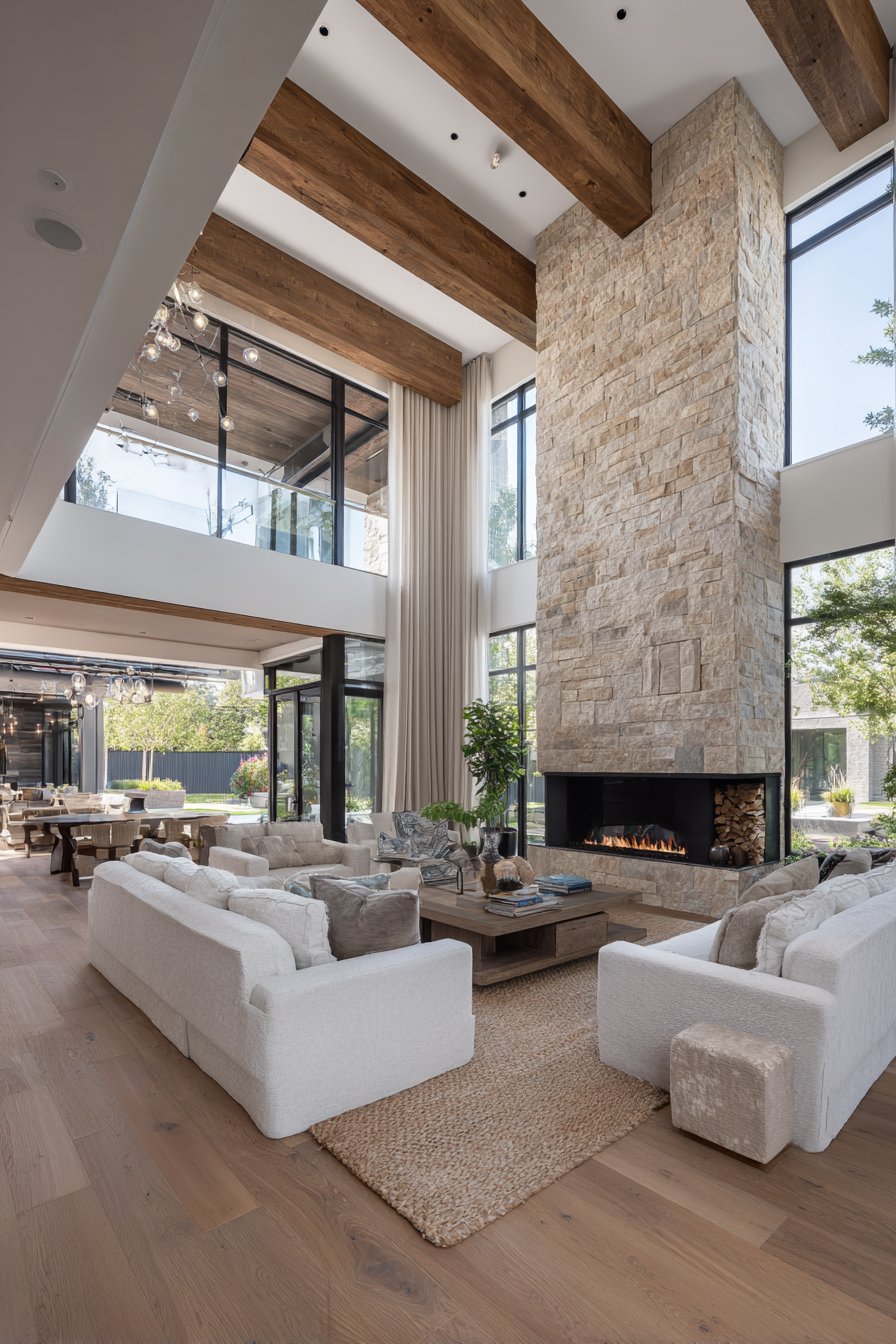 Different flooring textures naturally delineate functional zones within open-plan living rooms. A plush area rug under the seating arrangement defines the conversation zone, while smooth hardwood indicates circulation paths. This subtle spatial definition maintains openness while providing clear functional boundaries.