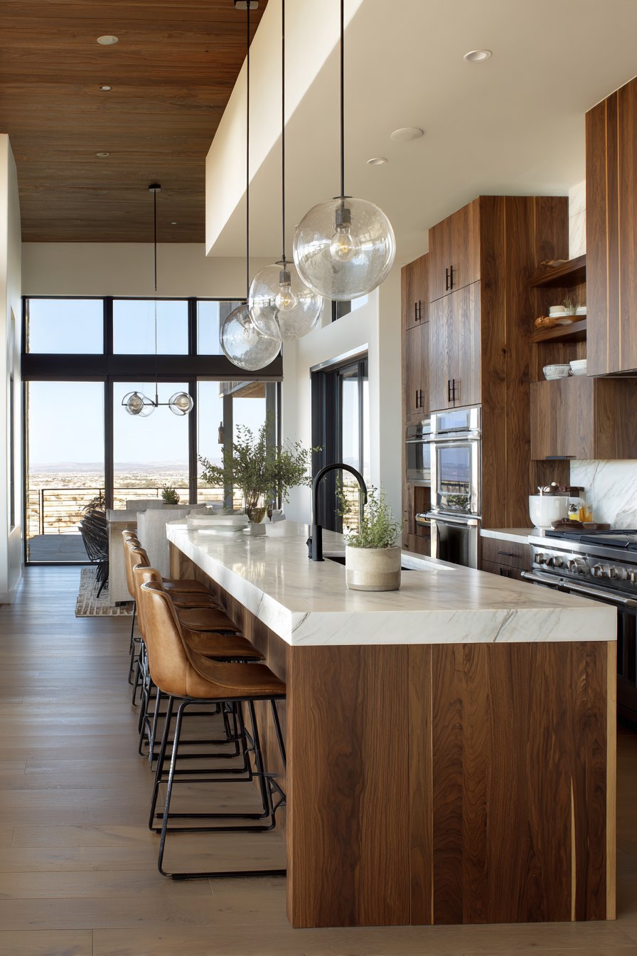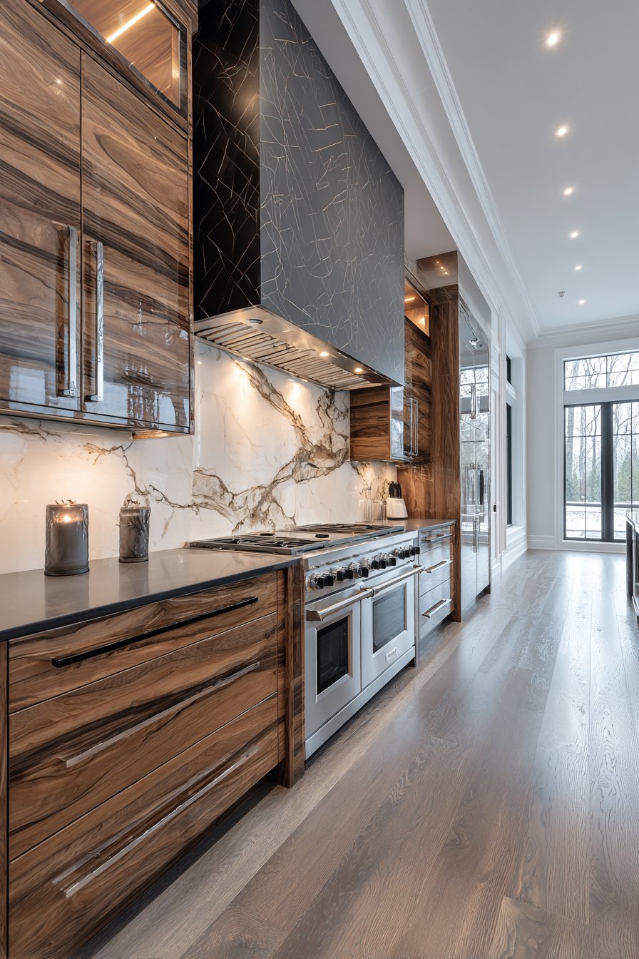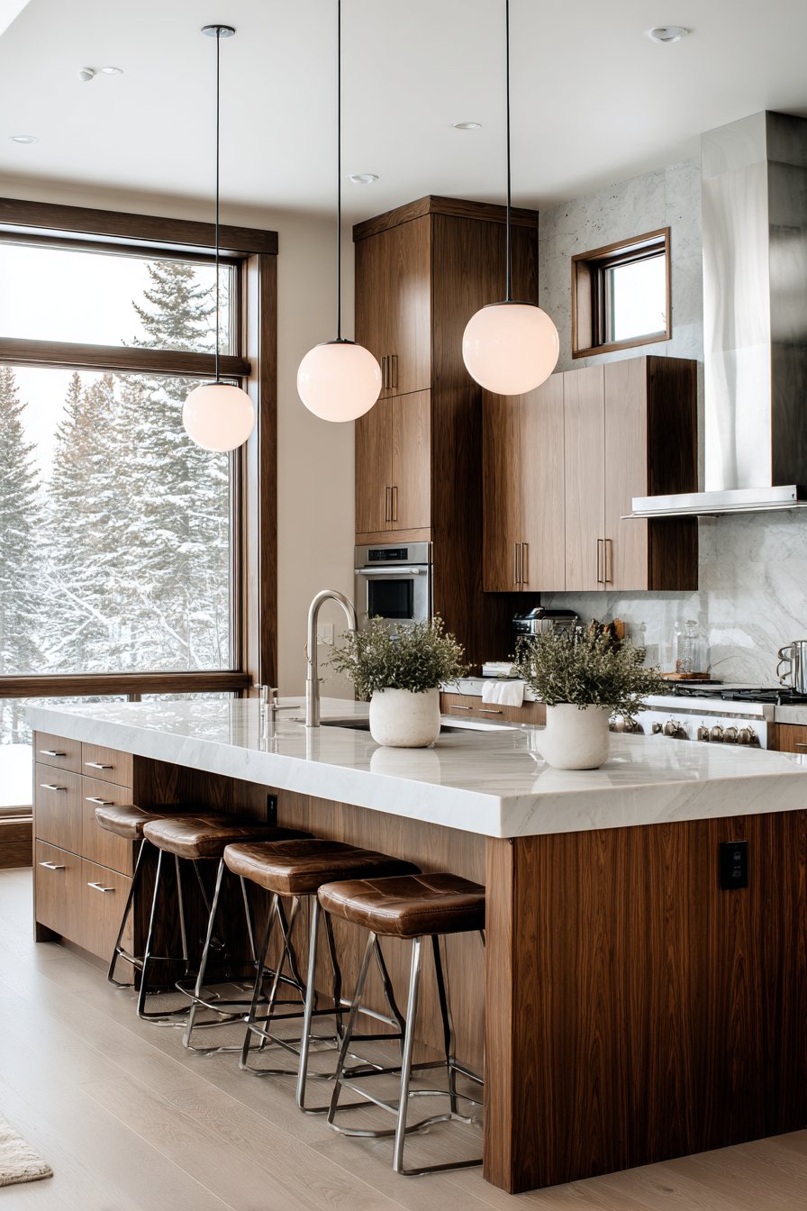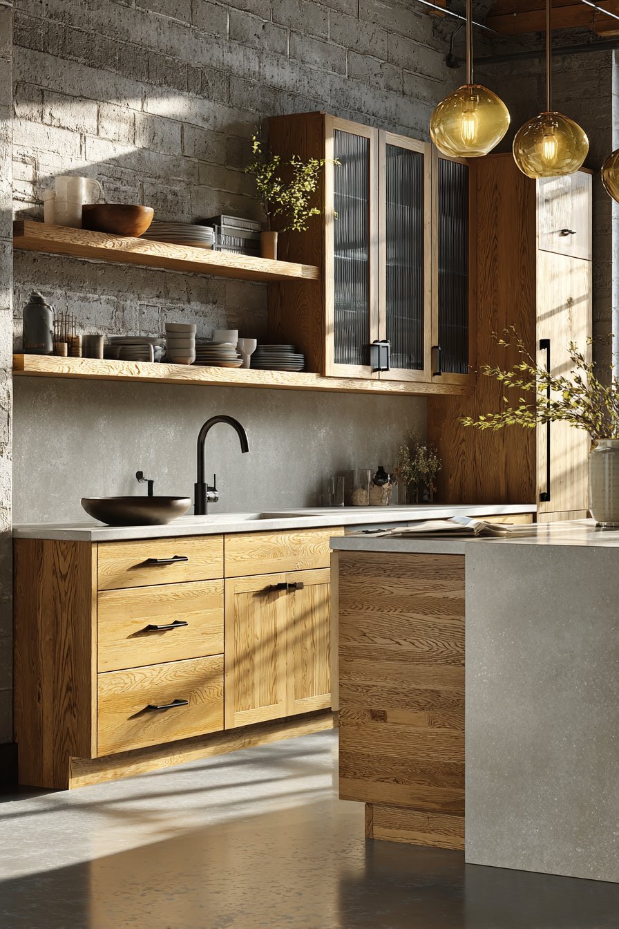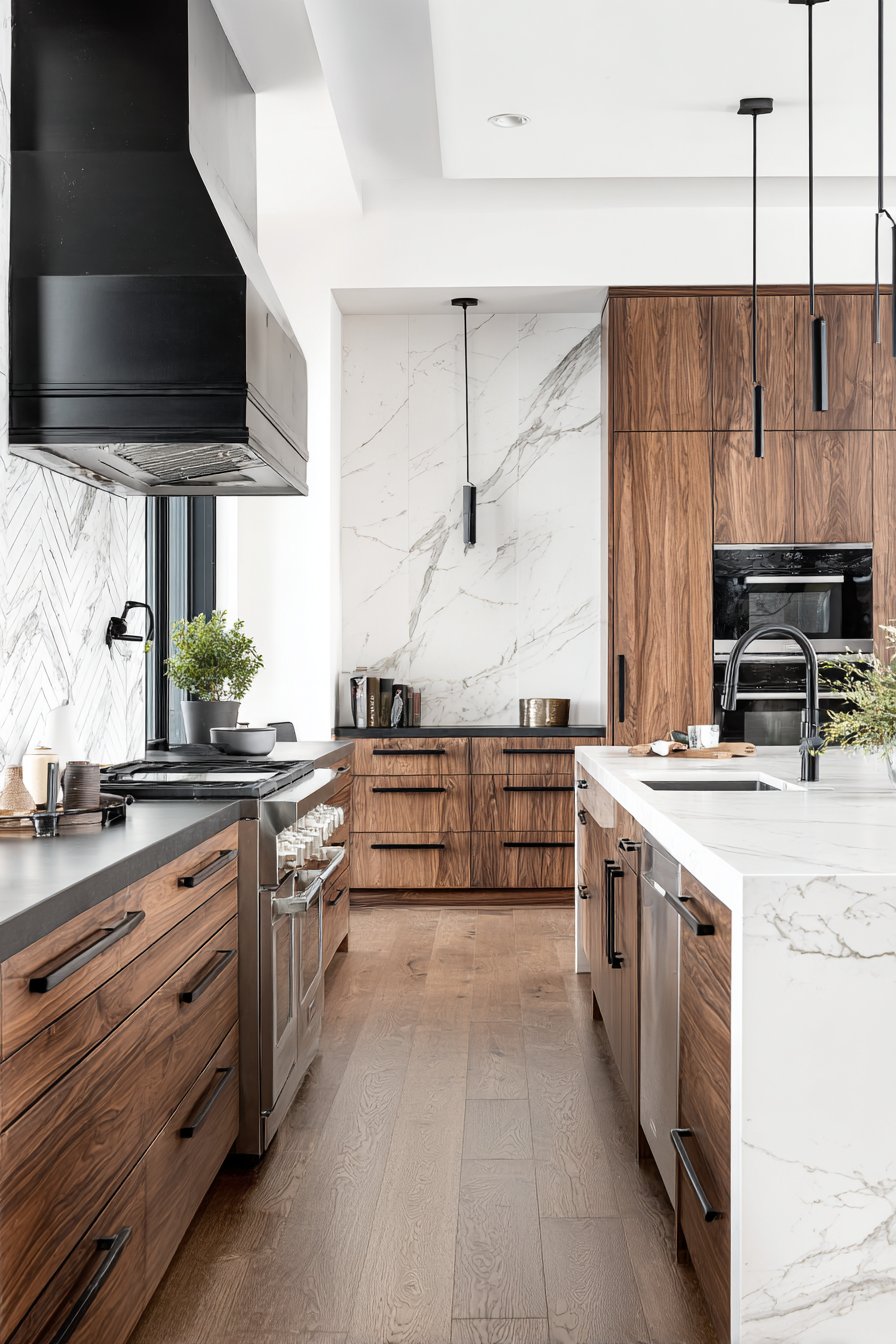Modern kitchens thrive on textural diversity, which creates depth and visual interest. Consider pairing your wood cabinetry with sleek marble countertops, stainless steel appliances, or matte black fixtures. These combinations prevent the space from feeling like a single-note design from decades past. The contrast between warm wood and cool metals or stone creates dynamic tension that feels intentional and current.