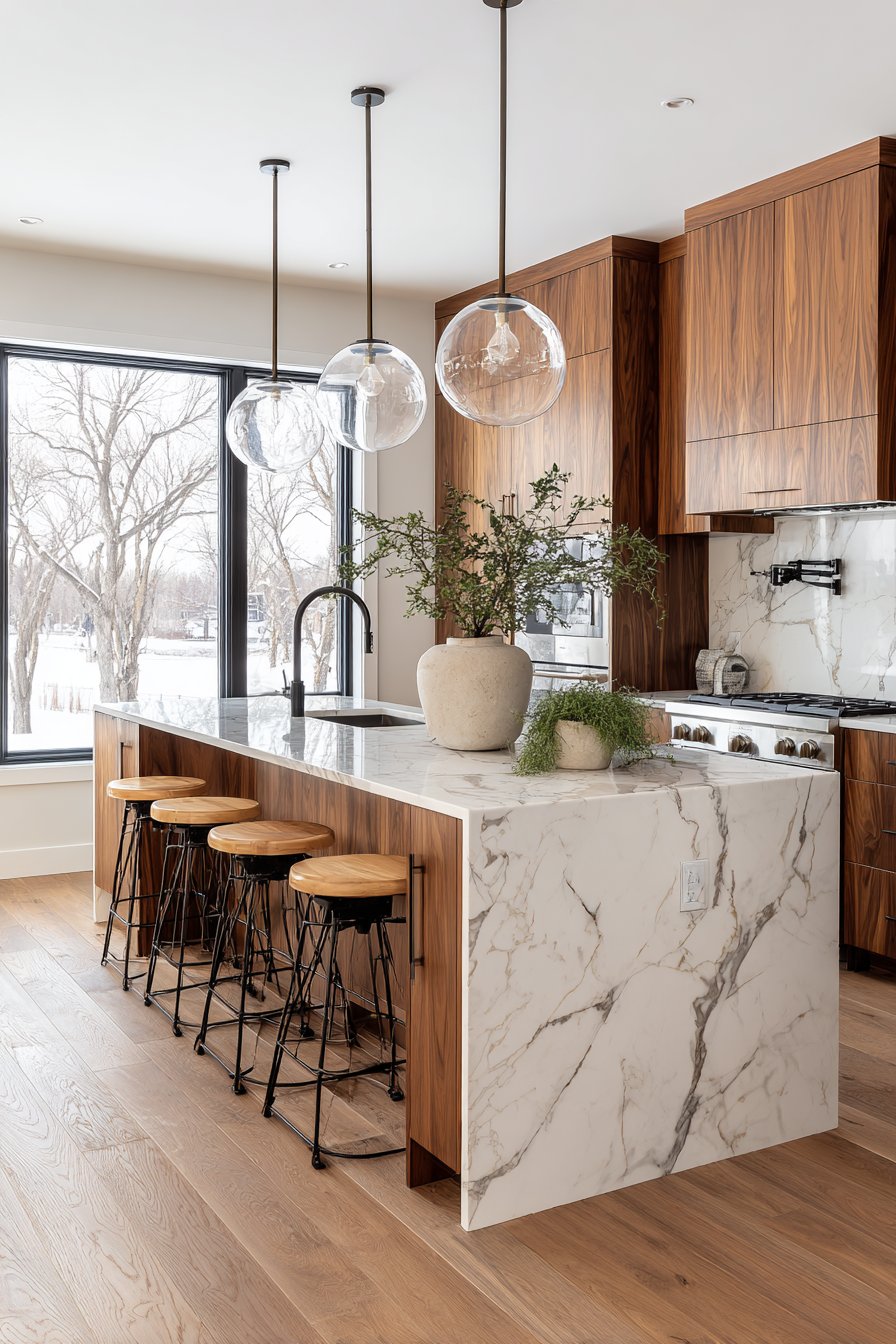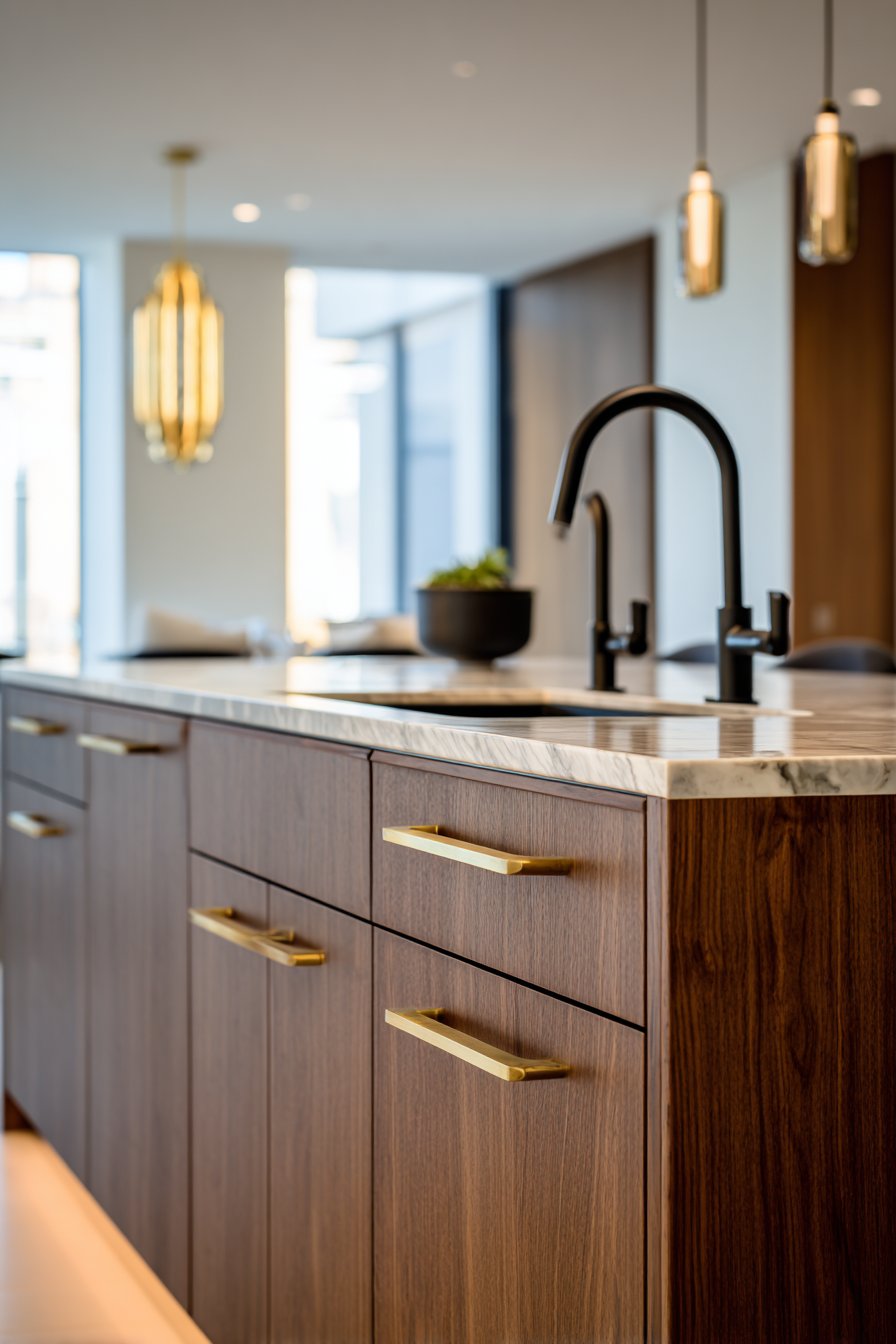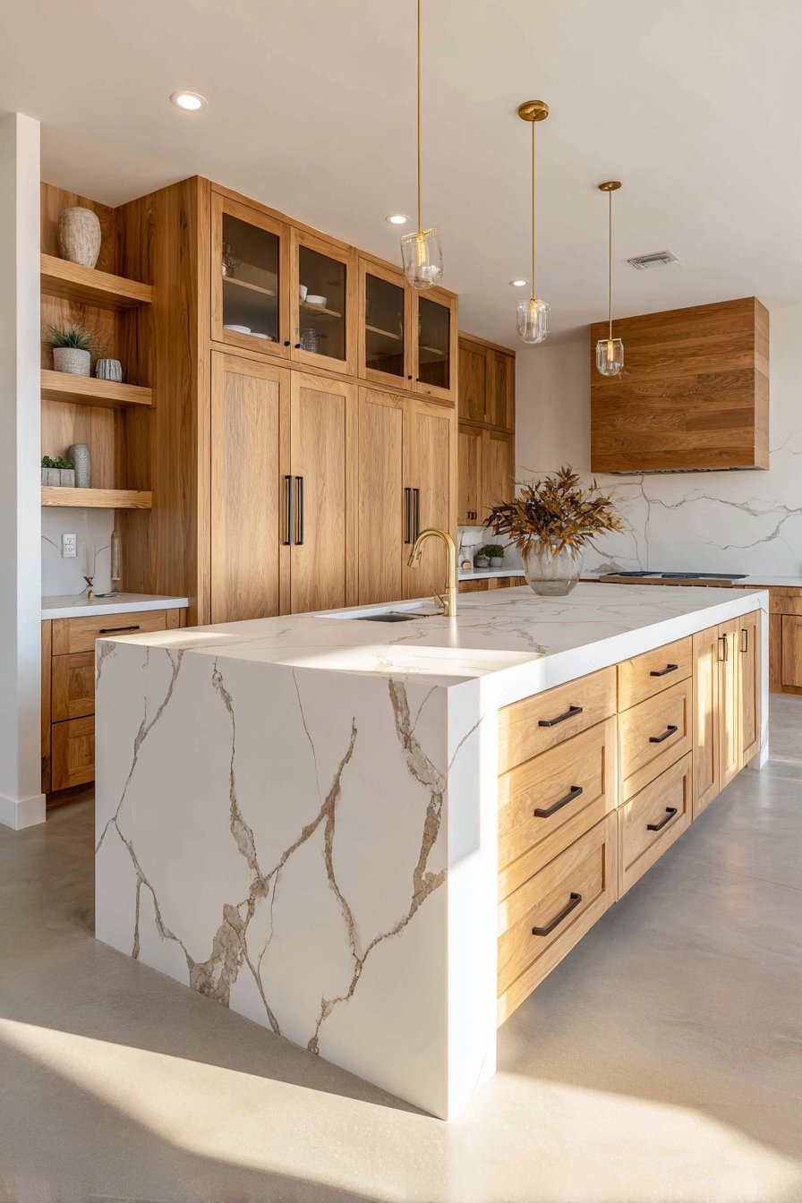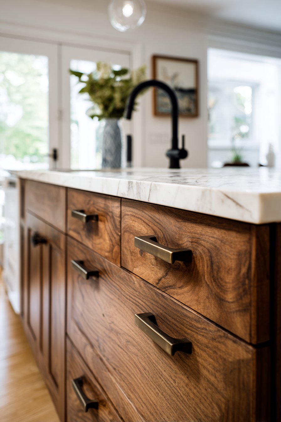 - Pair wood cabinets with quartz or marble countertops for elegant contrast