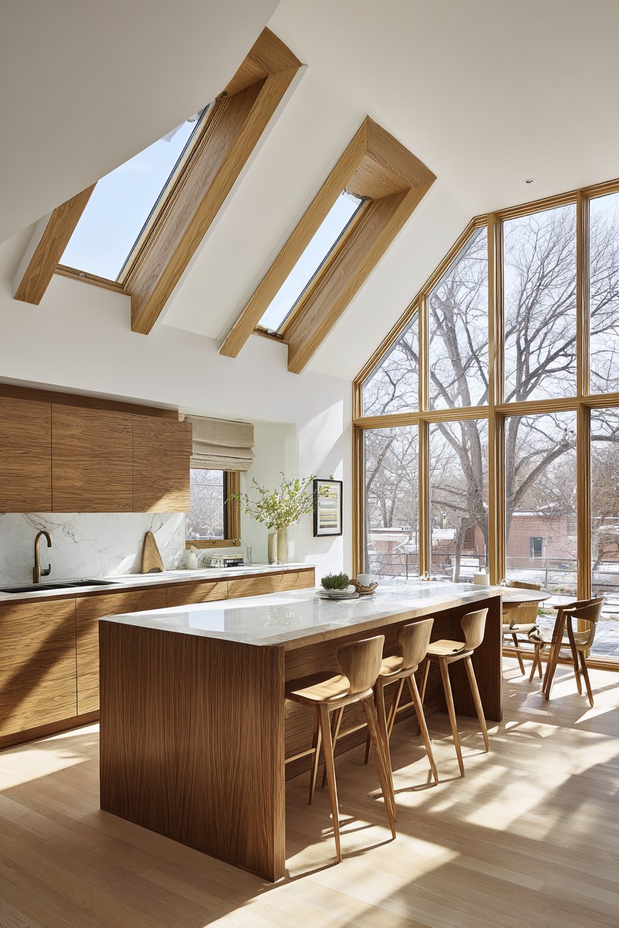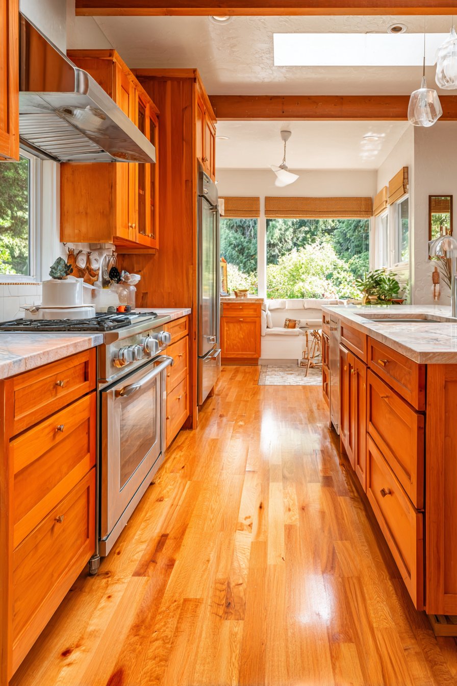 If structural changes are possible, consider enlarging existing windows or adding skylights to flood the space with daylight. Natural light prevents wood cabinetry from appearing heavy and makes the space feel larger and more contemporary. It also showcases the beautiful grain patterns in your wood, reminding viewers why you chose this material.