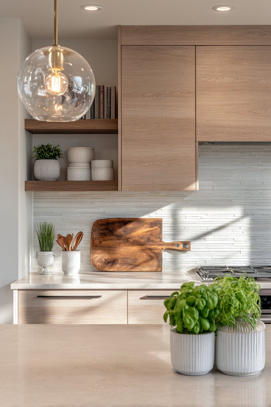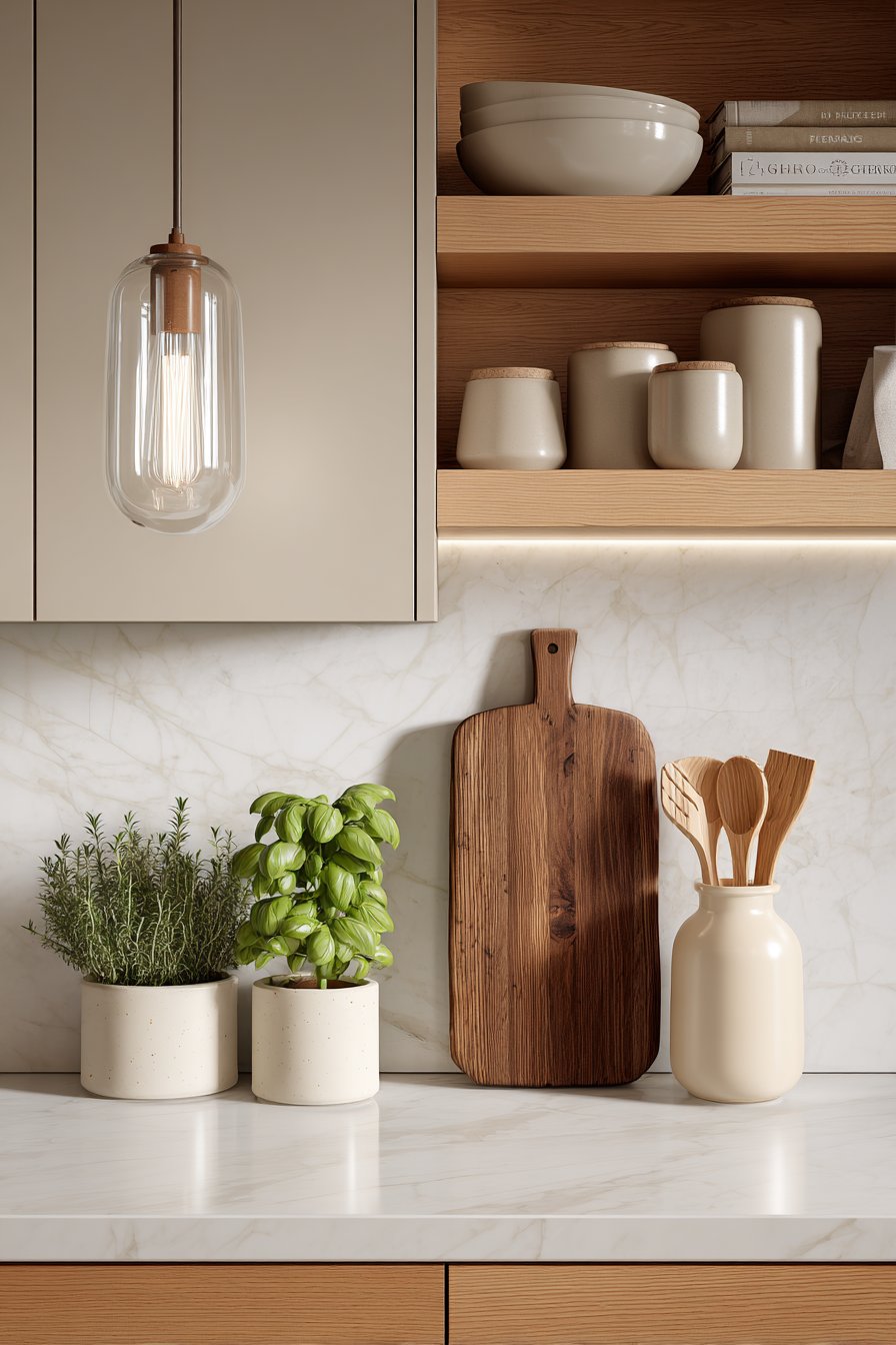 Modern kitchens favor functional beauty, where displayed items serve both practical and aesthetic purposes. A beautiful cutting board, sleek knife block, or ceramic utensil holder can add style without clutter. Avoid displaying too many small appliances, decorative plates, or country-style accessories that compete with your wood cabinetry for attention.